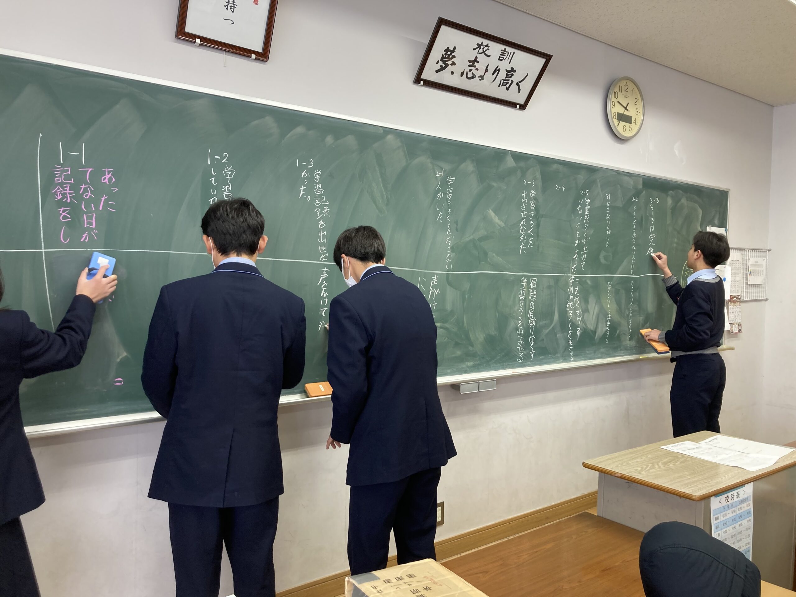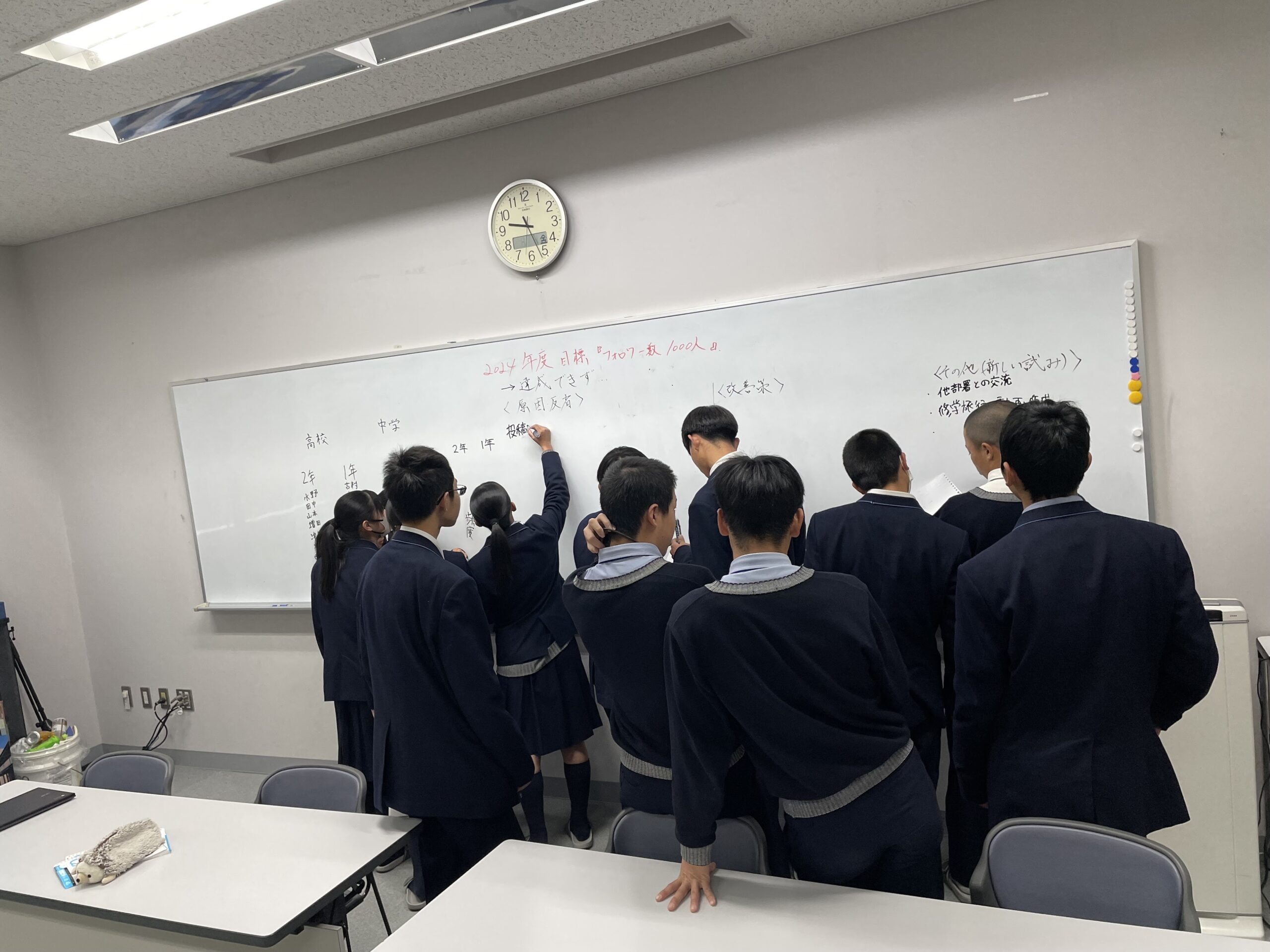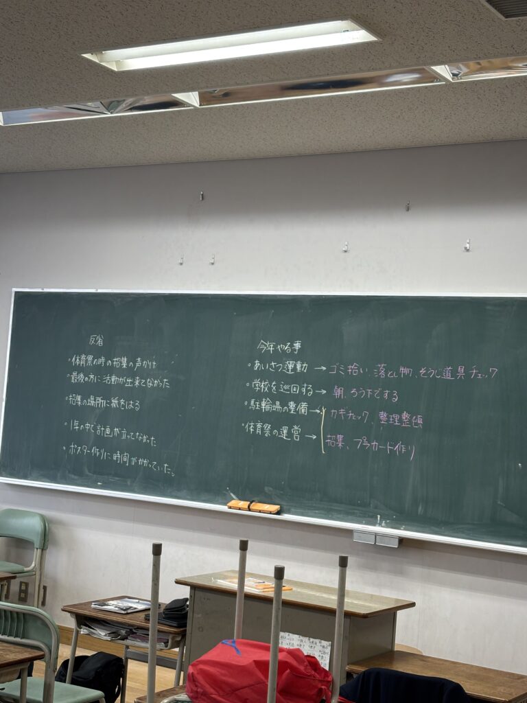 それぞれの部署で、来年度に向けて前向きな話し合いが行われました。中高一貫校ですが、中高合同で何かをすることはあまりないので、学校運営について中高異学年の生徒が意見を出し合い、活動するのはとても貴重な経験であり、大きな刺激があると思います。自分達の成長の為にも、リーダーからの話を受け身に捉えるのではなく、主体的に学校の為にできることは何かを考えて行動できる人間になってほしいと思います。高川学園を、ぜひみんなが誇れる学校にしていきましょう!