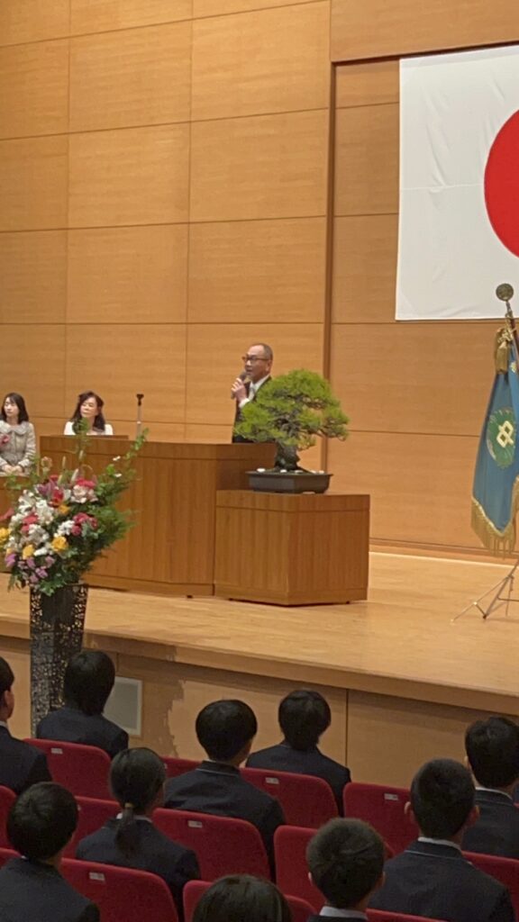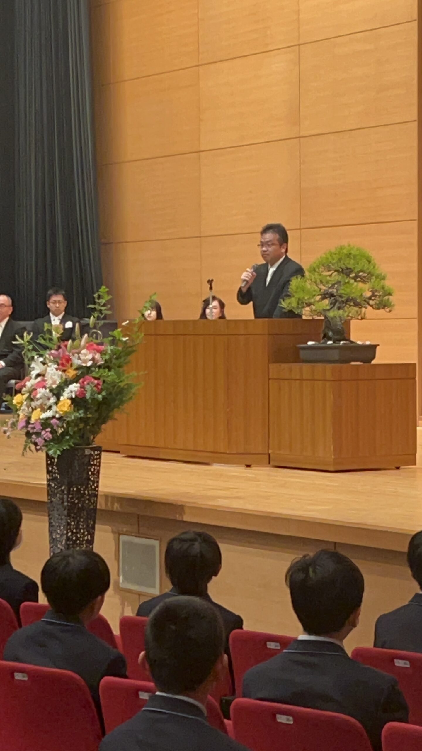 保護者の皆様、新入生のみなさん、ご入学誠におめでとうございます。真新しい制服に身を包んで、かっこいいですね。これから中学3年間、そして高校3年間の計6年間、教員と保護者の皆様で協力して、皆さんを教え導いていきたいと思います。さて、みなさんは日頃家族が運転する車に乗るときの指定席はどこですか?車内では、色々な話をしたり、音楽を聴いたりしていると思いますが、車が発している音を気にしたことはありますか。車は、道を曲がるときやバックするとき、車内からウインカーをあげたり、ギアをバックに入れたりしていますが、その際は音がすると思います。では、車外ではどうかというと、ランプが付いて信号が出されます。これはいったい何のためでしょうか。前後の車にサインを出しているのです。例えば、前の車からブレーキを踏んだサインが出されたら、自分もぶつからないようにブレーキを踏むというように、周りの車のサインを見ておかないと事故になります。お互いに息が合うことで、たくさんの車が道路を走っていても事故が起きないようになっています。わき見運転をすると、見逃して交通事故を起こしてしまいます。車は便利だし安心して乗っていると思いますが、運転する人は常に気を付けなければなりません。これは、人間関係とよく似ていると思います。仲良く過ごしていても、けんかになることがあると思います。しかし、信号を発する側と受け取る側とのキャッチボールがしっかりとできていれば、大きな事故にはならないはずです。相手への思いやりや気遣う心を持って、毎日の学校生活を送ることが、人との触れないで大事なことであり、学校生活が楽しくなるはずです。今日から、家よりも多くの時間を、この学園で過ごすことになります。勉強、給食、部活、その全ての時間が楽しくなければならないと思います。今日から「事故」を起こさないようにみんなで気遣って生活しましょう。
