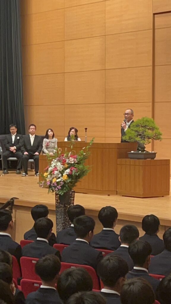 桜が咲くのが遅かったせいか、今日の良き日にまだ桜が咲いてくれています。とても喜ばしいことです。新入生のみなさん、ご入学誠におめでとうございます。午前中、中学校の入学式がありました。退場の際に例年以上に保護者の方の笑顔を目につき、とても嬉しくなりました。保護者の皆様、本校を選んで入学してくれたお子様の門出を、ぜひ笑顔で祝っていただきたいと思います。新入生が式前にポーズをとって集合写真を撮る姿を見かけましたが、皆さんの顔が凛々しくて覚悟ができているように見えました。これからの3年間はすごく大事です。人生の生き方、進む方向がほぼ決まる時期です。楽しいことだけではなく、苦しいこともたくさんあると思います。3年間頑張る覚悟が必要です。そして、覚悟があれば自覚も芽生えると思います。自覚を持って3年間を過ごしてほしいと思います。受け身ではなく、どの場面においても自覚を持って主体的に行動することで責任が生まれます。そうやって成長してほしいと思います。高川学園には、他の学校にはない取り組みがあります。金曜の1時間目に行われている、部署活動です。委員会があり全員が入ることになります。教員もそれぞれの委員会に配属されますが、指示をするのではなく、そばで見守ってたまにアドバイスをする程度です。生徒達の主体的な活動を重視しています。この取り組みは、大学の授業(ゼミ)に似ていると思います。このような活動を高校で体験できるのは素晴らしいことです。先輩に任せておけばいい、では主体性は芽生えません。中学生も一緒に活動するので、新入生のみなさんも主体的に活動して、中学生を導いてほしいと思います。ぜひ、有意義な時間にしてください。あなたたちが高川学園を選んだのは、間違いではない。ぜひ、そう思える時間にしてください。