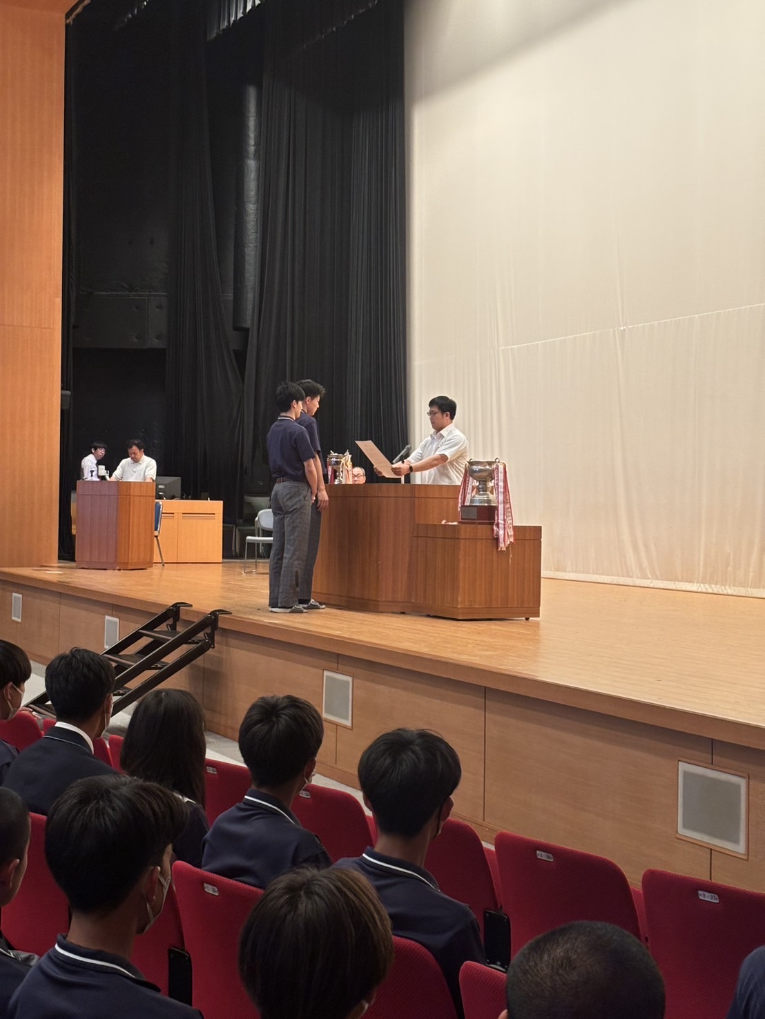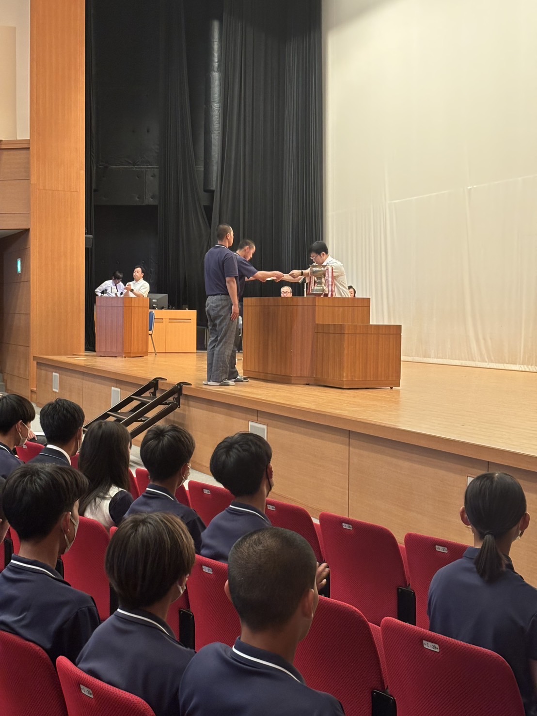 ずいぶん熱くなっていますね。見渡すと夏服の人が多いようです。賞状伝達では陸上部が表彰されていましたが、100m走といえば陸上の花形の競技ですから、素晴らしいですね。男子バレーボール部は昨年も優勝していますが、決勝戦もストレート勝ちはすごいですね。硬式野球部が私学大会優勝、全試合コールド勝ち、ホームラン4試合で5本と素晴らしい活躍でした。夏に向けて打撃力がついてきています。今後が楽しみです。