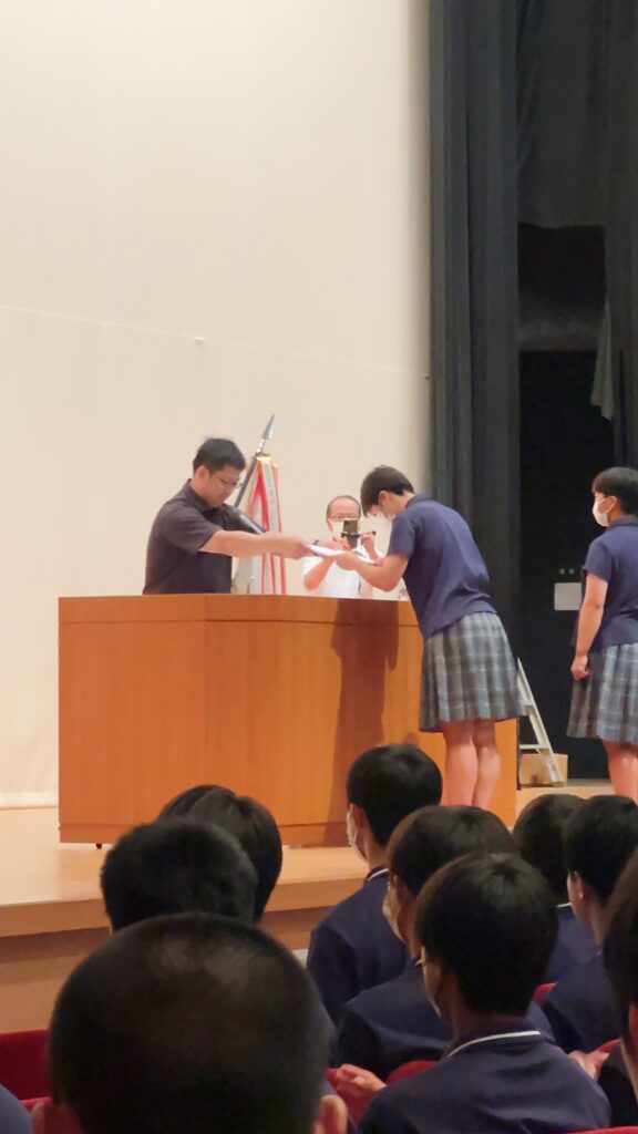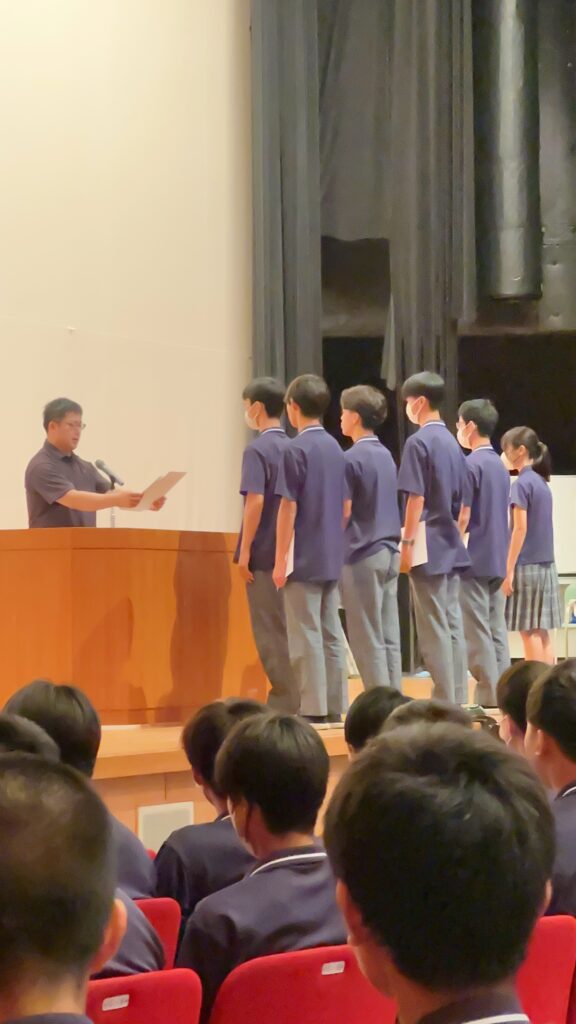 みなさんおはようございます。今日もたくさんの人が表彰されました。素晴らしいですね。壇上から見るとマスク姿の人が多いですね。中国大会を控えている人がいますのでしっかりと体調管理をしてください。先日、男子サッカー部のインターハイ予選を観戦しました。決勝戦は都合がつかず準決勝を観戦しましたが、山口県鴻城高校相手に素晴らしい試合をしていました。決勝戦は観戦できませんでしたが、YouTubeで3回観ました。コーナーキックから得点する場面がありましたが、前半3分で決めたので勢いがついてよかったと思います。決勝戦は3-1で勝ちましたが、得点する選手が3人とも違いました。選手層の厚さが分かりますね。全国での活躍も期待できそうです。昨日は部活動視察で第一体育館に出向き、バレー部の練習風景を見ました。活気があって練習を見ていても上手いなと思いました。インターハイ予選の試合観戦はできませんでしたが、男子バレー部は7点ビハインドからセットを取る場面があったと聞きました。相変わらず力がありますね。女子バレー部は誠英高校から1セット取ることができました。県での優勝も近い気がしますね。部活動の練習や試合を見に行くと、生徒が椅子を用意してくれたり、雨の日には傘を差してくれたりします。スポーツをしていると、技術だけでなく人間性も磨かれているのだと思います。今年度もたくさんの部活がインターハイに出場することになりました。頑張ってください。硬式野球部は、今日夏の大会の抽選会があります。先日の私学大会は全試合コールドゲームでした。打撃が素晴らしく、ピッチャー陣も揃っているので県大会が楽しみです。ぜひ、仲間を大切にして、部活動をしている生徒もしていない生徒も、部活動の応援をしてあげてほしいと思います。共通テストまで、半年となりました。3年生はあっと言う間に受験になります。この時期にしっかり知識を蓄えてください。先生方は徹底的にフォローしてくれますので、出来るだけ希望する進学先に行けるように頑張ってください。就職する人も夏から就職に向けての準備が始まりますので、頑張りましょう。それぞれが自分の可能性を信じて、自分の目標に向けて邁進してください。