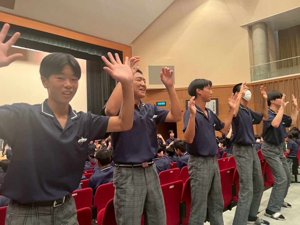幕が下りたところに、劇中で主役を演じたルビッチ役とプペル役の2人が登場!!劇動画撮影での苦労や、動画を観た感想を話した後で、3年生全員でプペルダンスを披露することになりました。嬉しいサプライズ!保護者の皆さんによる動画撮影が始まりました。間奏の間に立ち位置を移動したりして、講堂にいるみんなで盛り上がりました。大きな拍手をもらって3年生はとても嬉しそうでした。(劇動画を撮影された保護者の方が多くおられましたが、後日たくさんの方から動画配信のリクエストをいただき、YouTubeで動画を限定公開しました。)
