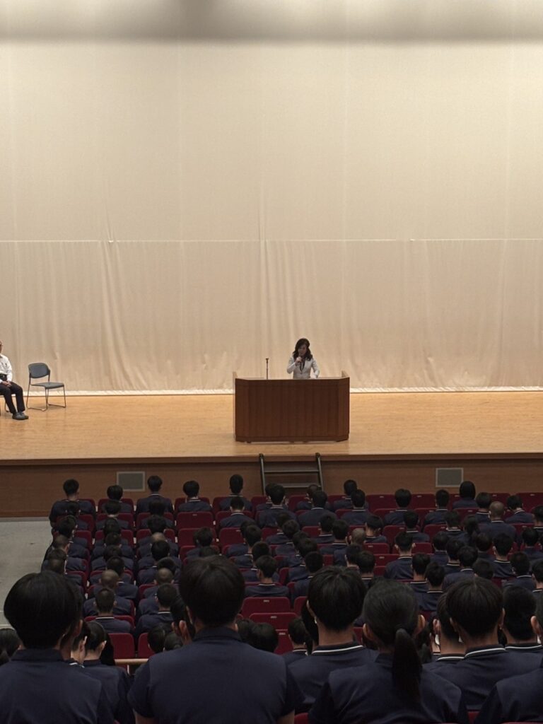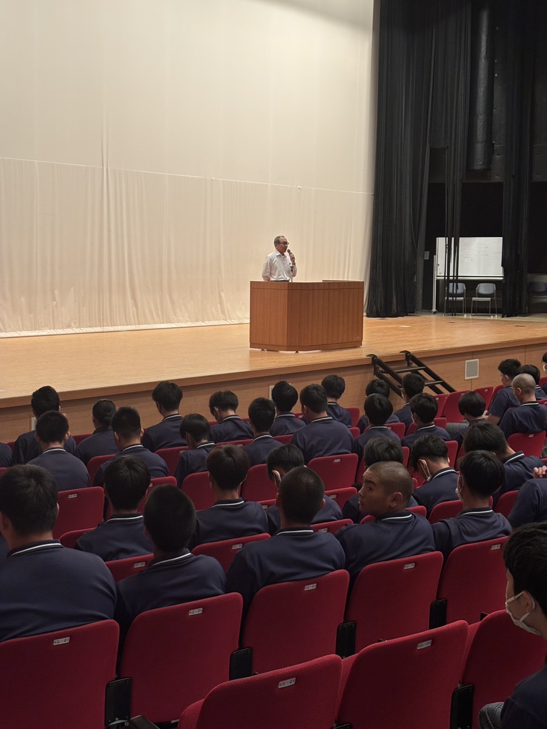 おはようございます。少し暑さが和らいだように思いますが、湿度が高くてすっきりしない気候ですね。気分が沈みそうな天気なのに、みんなは姿勢がよくていいですね。2学期は学期の中で一番長く、スポーツの秋、勉強の秋、食欲の秋ですね。学園は特にスポーツを頑張っている人が多いですね。スポーツのいいところは、応援も含めてチーム一丸となって頑張るところだと思います。これは社会人になってなかなか味わえないことです。昨日、タカガワグループが融資を受けている阿波銀行の方が来校され、施設の素晴らしさに感動されていました。それ以上に感動されたのは、運動部の生徒の挨拶が素晴らしかったことです。挨拶は対人関係においてとても大切です。これからも特に来校者には気持ちの良い挨拶を心がけましょう。今年度の国スポは、男子バレー、サッカー、ゴルフ、硬式野球部が出場します。参加費用は県負担です。山口県代表として参加する意識を持ってください。全国大会なので注目度が高いです。自分達の目標に向けて頑張るだけでなく、学園の知名度を上げてほしいと思います。甲子園は他の全国大会に比べると知名度が高く、先月のことなのに今もまだ出会う人に「甲子園出場おめでとうございます」と言われます。注目度が上がると、悪いニュースを探して晒そうとする人が出たりします。部活動を頑張ることは大事ですが、日頃の生活をきちんとすることも大切です。携帯電話は生徒にとっていい情報と悪い情報が混在しています。特に3年生は今からとても大切な時期です。携帯電話は、情報を得る為のツールとして今は欠かせないものです。しかし、誘惑がとても多いので使い方を考えて自分を律して生活してください。高校生は、いい人生を送る為の礎を作る時期です。これからの人生は、どこの大学に進学するか、どこに就職するかで大きく変わってきます。学校生活を大事に過ごしてほしいと思います。それぞれの部活が大事な試合を控えています。目標はそれぞれと思いますが、上を目指してほしいと思います。