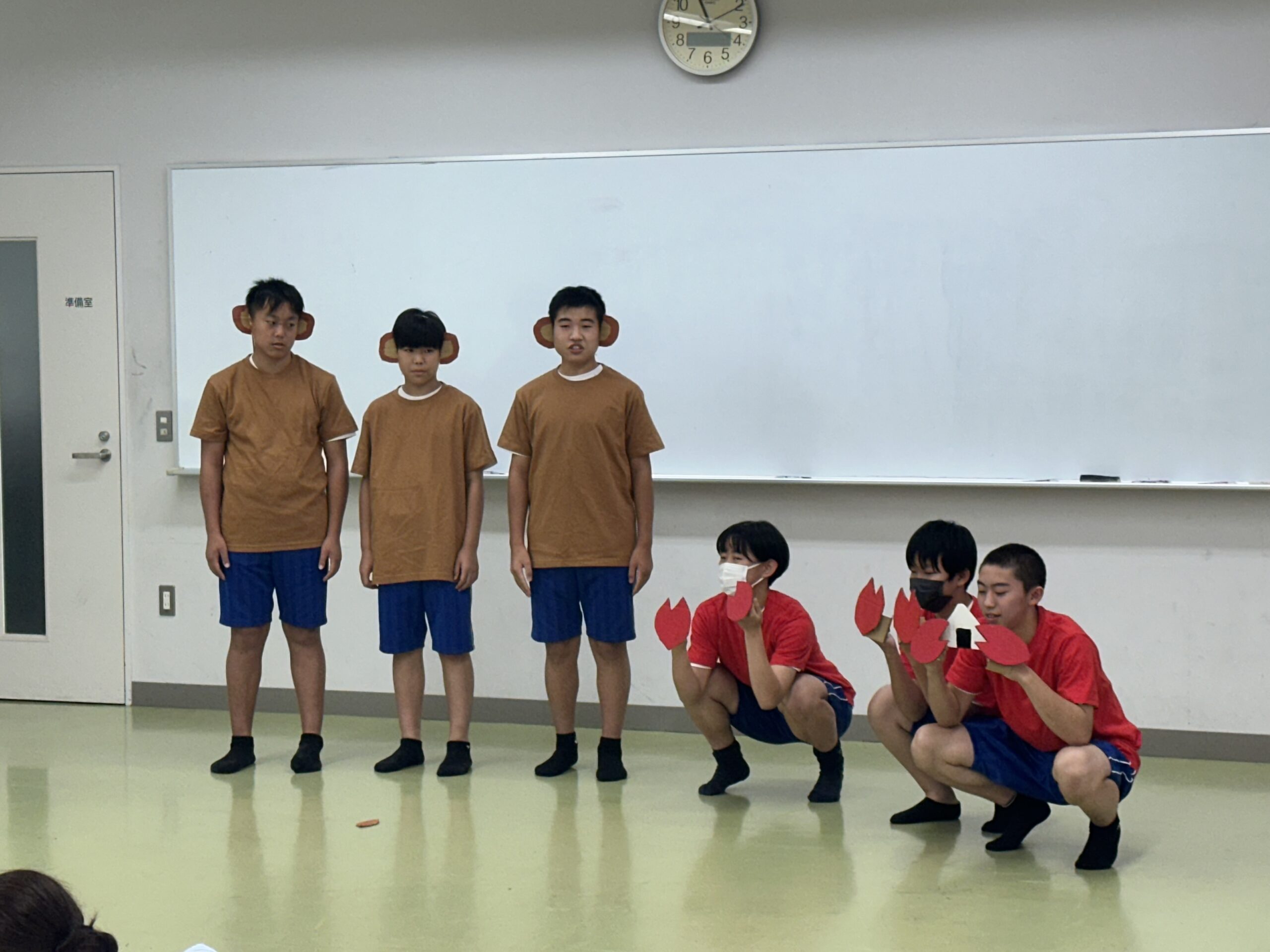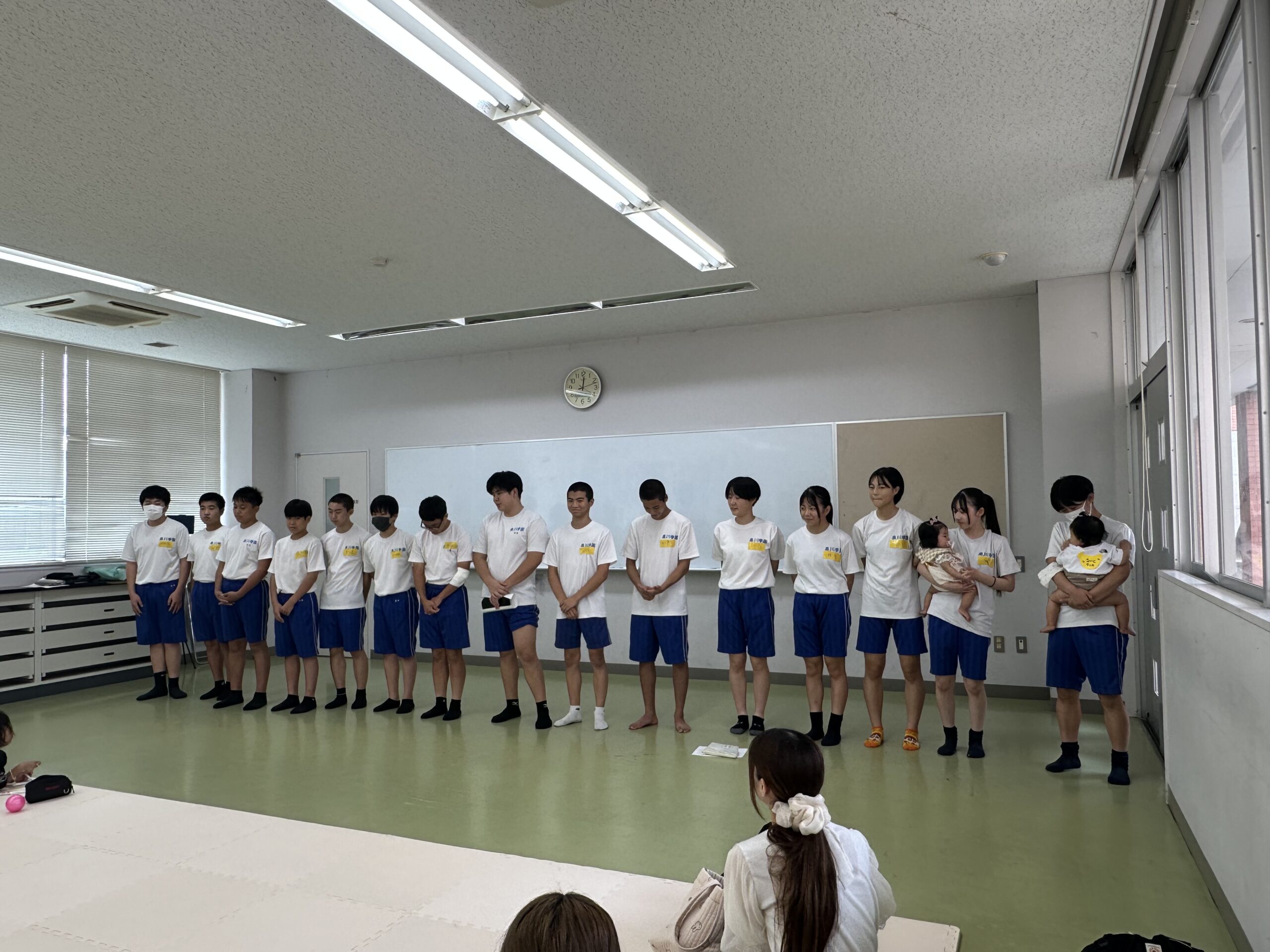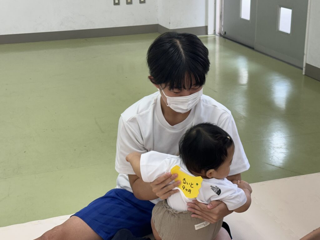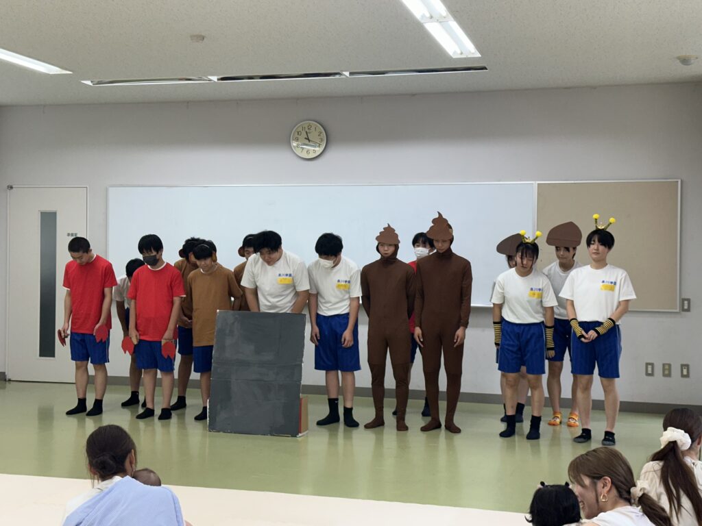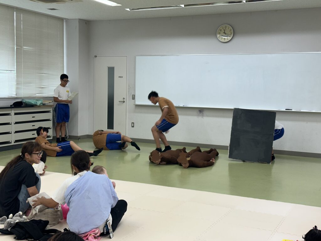 9月18日(木)に乳幼児とのふれあい体験を実施しました。3日目は3年2組でした。クラスの出し物は劇「さるかに合戦」。かにの爪、かるの耳、ふんのお面、栗のお面・・・段ボールの手作りがかわいいですね。出し物の後はふれあいタイム。朝から天候が悪かったので心配していましたが、ちょうど雨があがり外遊びができました。短い時間でしたが、お父さんお母さんから子育てについて色々な話を聞くことができ、楽しい時間を過ごすことができました。来週もやりますので、ぜひご参加ください。