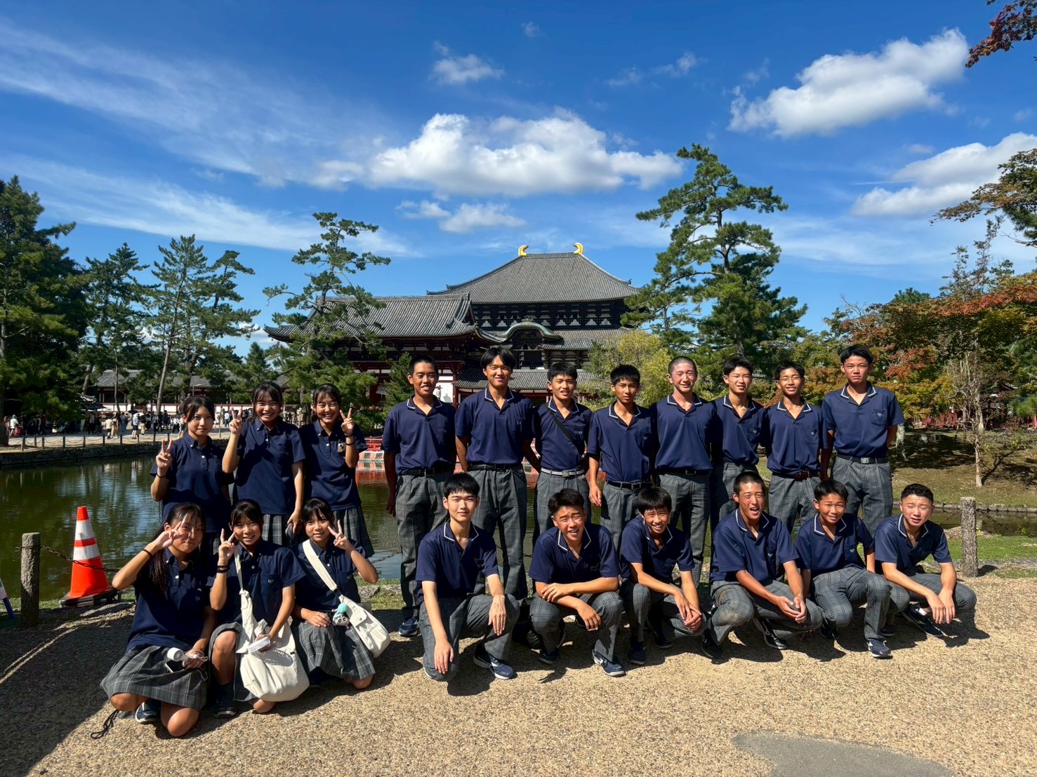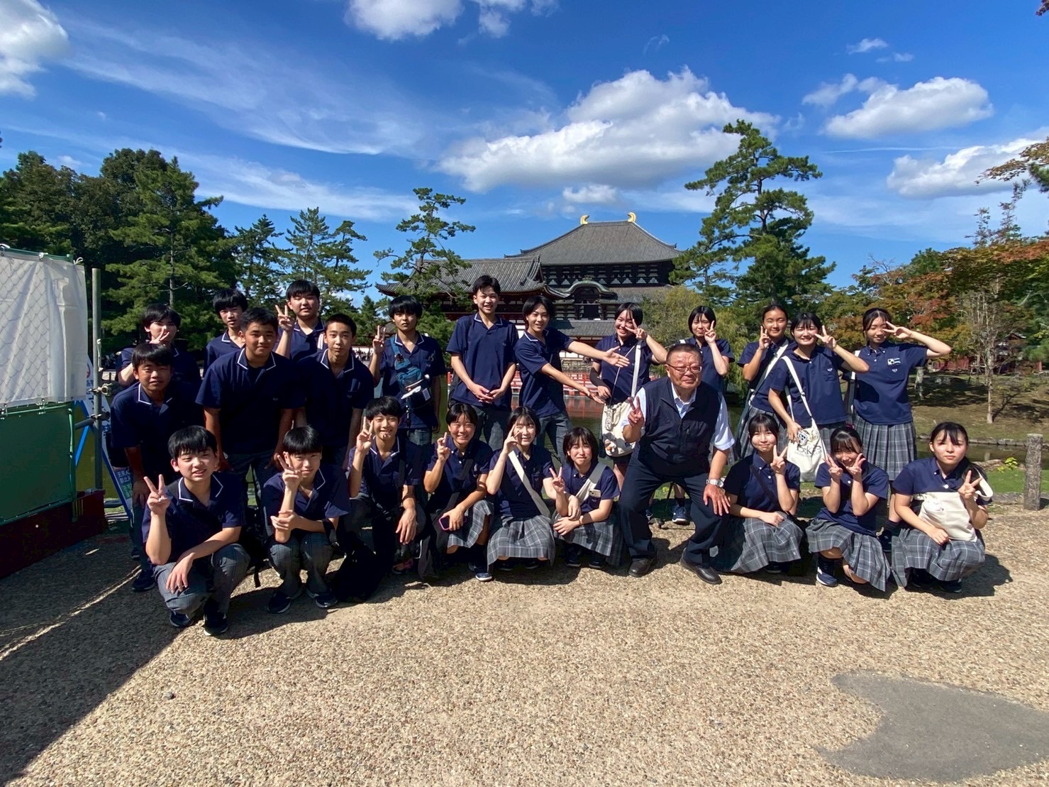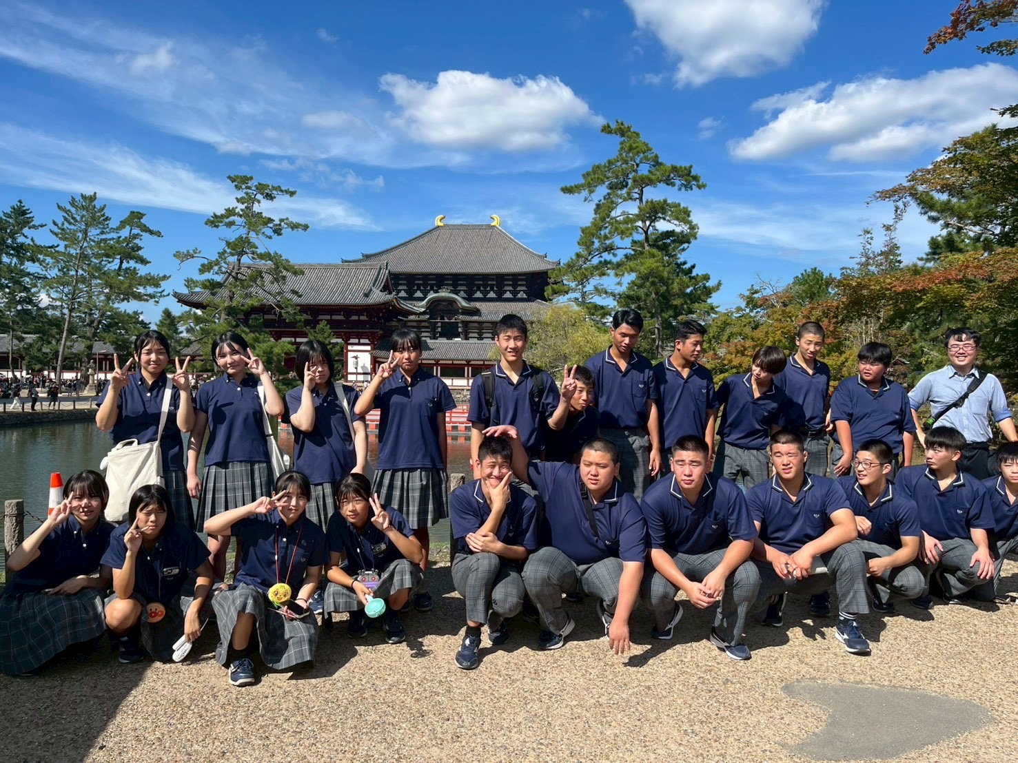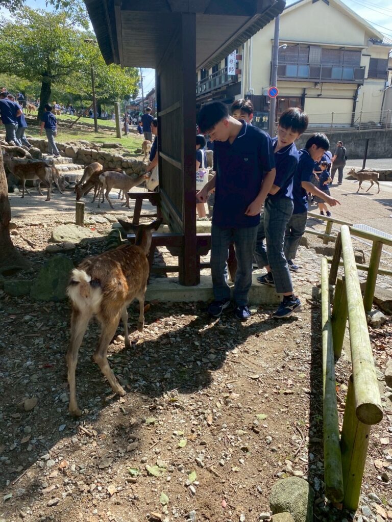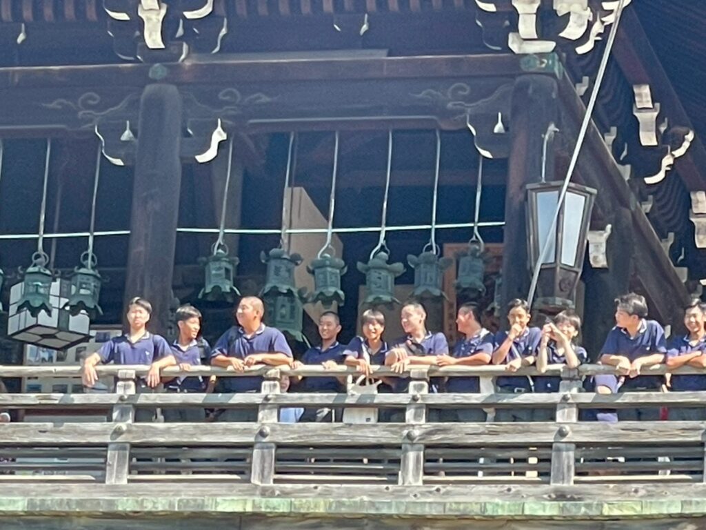 待ちに待った出発当日、朝7時20分に新山口駅コンコースに集合しました。「さくら」に乗って新神戸駅へ。貸切バスで奈良へ移動。まずは奈良市内のホテルで腹ごしらえ。昼食を済ませると、修学旅行定番コース、若草山→三月堂→二月堂→東大寺大仏殿を巡りました。