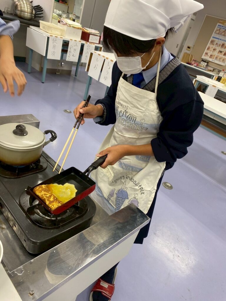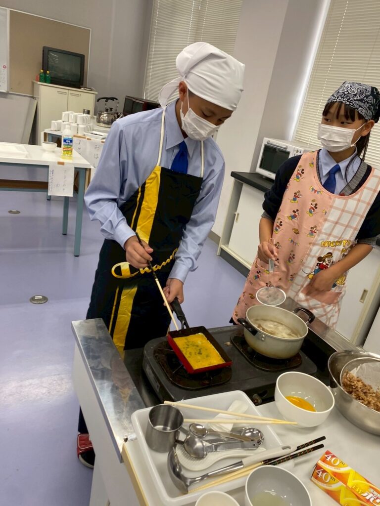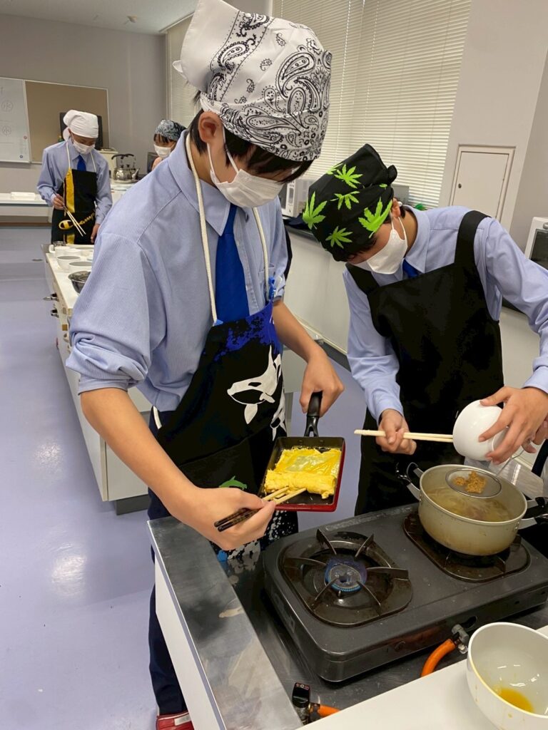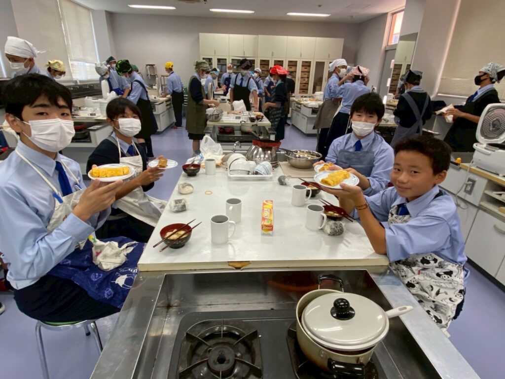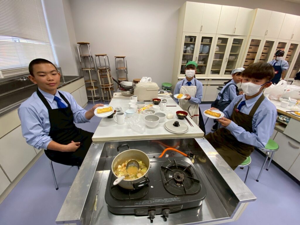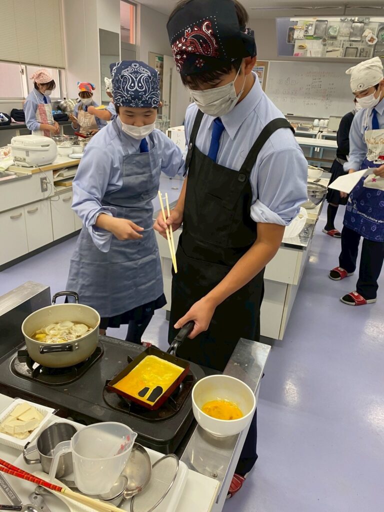 10月30日(木)に中学1年3組が調理実習を行いました。メニューは、ご飯、みそ汁、卵焼きです。クラスメイトとの調理は今回が初めてです。事前に役割分担を決めて、調理手順を予習して実習に臨みましたが・・・。卵焼きは、一人ずつ作ります。お母さんが作ってくれる卵焼きはいつも美味しくてきれいな形なのに、自分で作るとこんなにもうまくいかないものなのか・・・と実感した生徒が多かったはず。