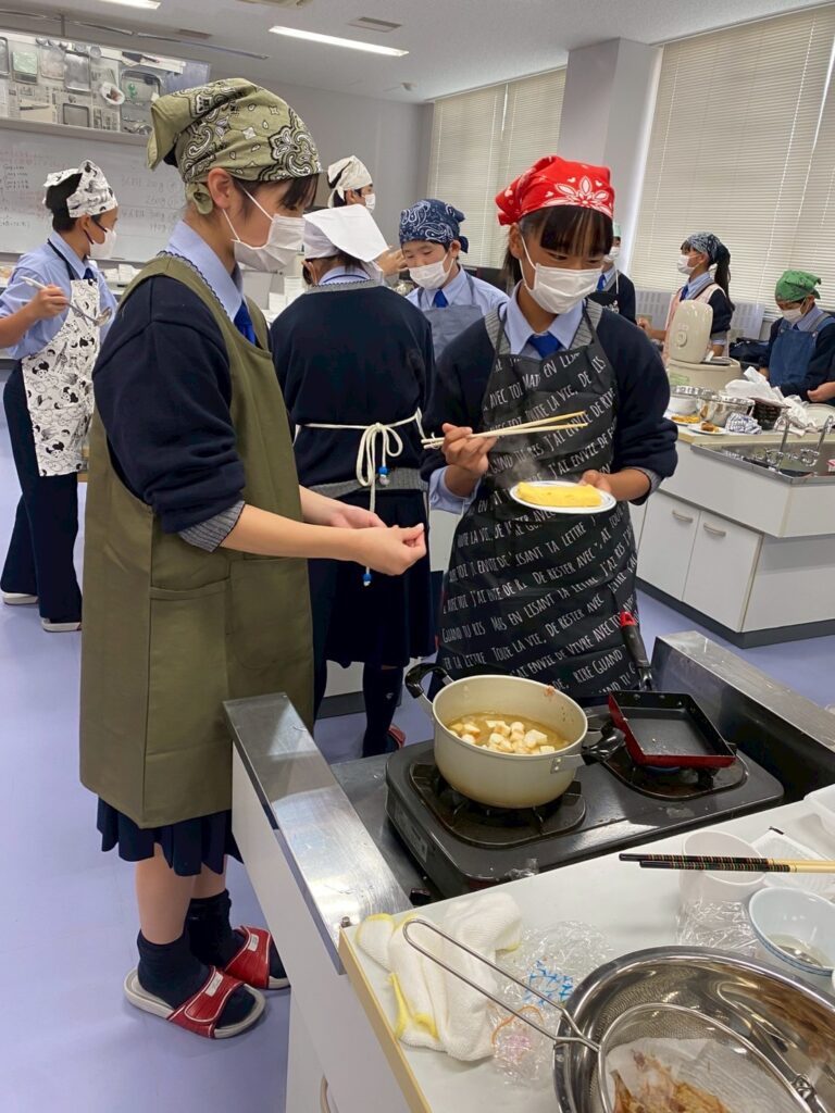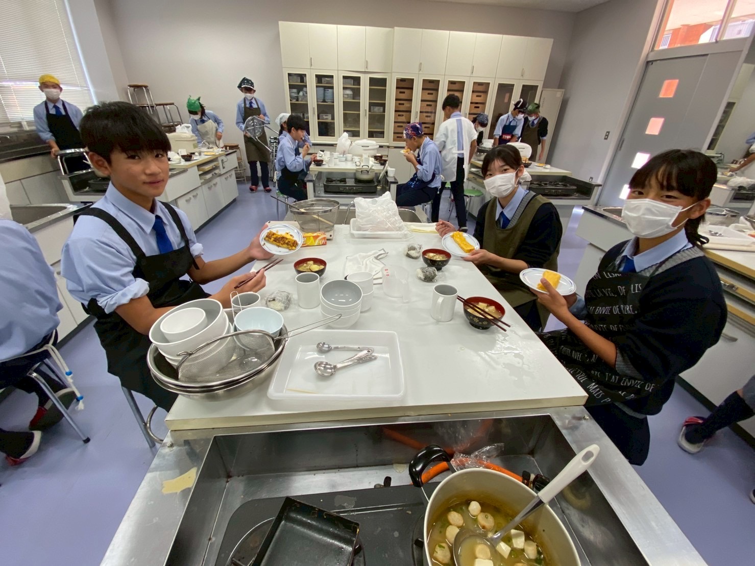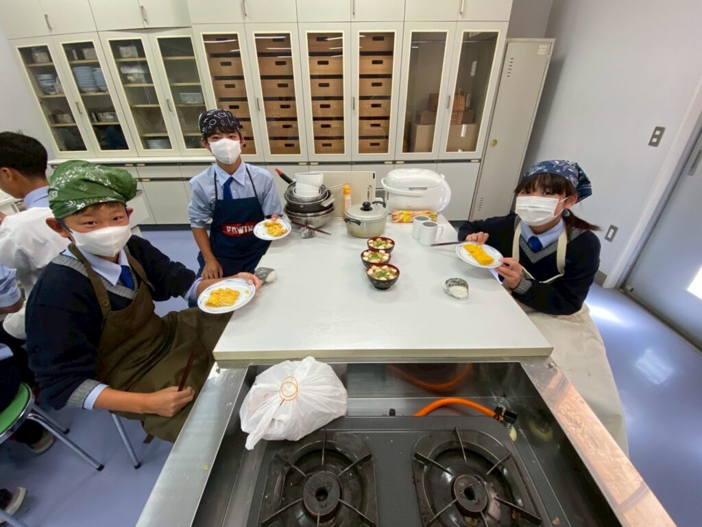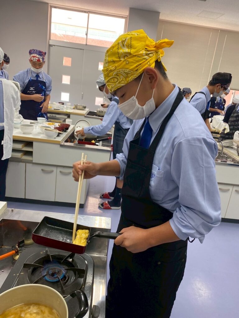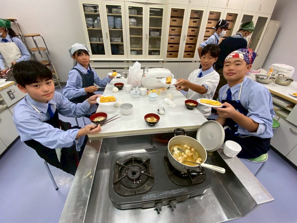10月30日(木)に中学1年3組が調理実習を行いました。メニューは、ご飯、みそ汁、卵焼きです。クラスメイトとの調理は今回が初めてです。事前に役割分担を決めて、調理手順を予習して実習に臨みましたが・・・。卵焼きは、一人ずつ作ります。お母さんが作ってくれる卵焼きはいつも美味しくてきれいな形なのに、自分で作るとこんなにもうまくいかないものなのか・・・と実感した生徒が多かったはず。