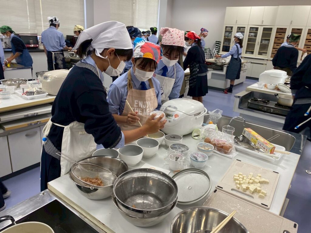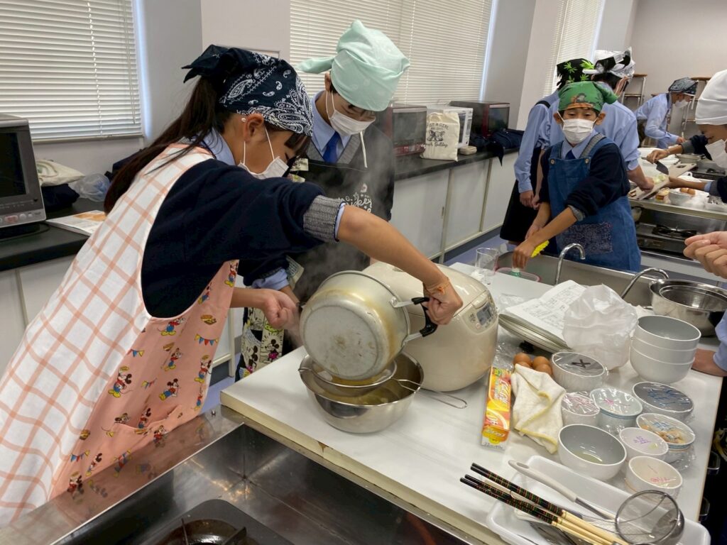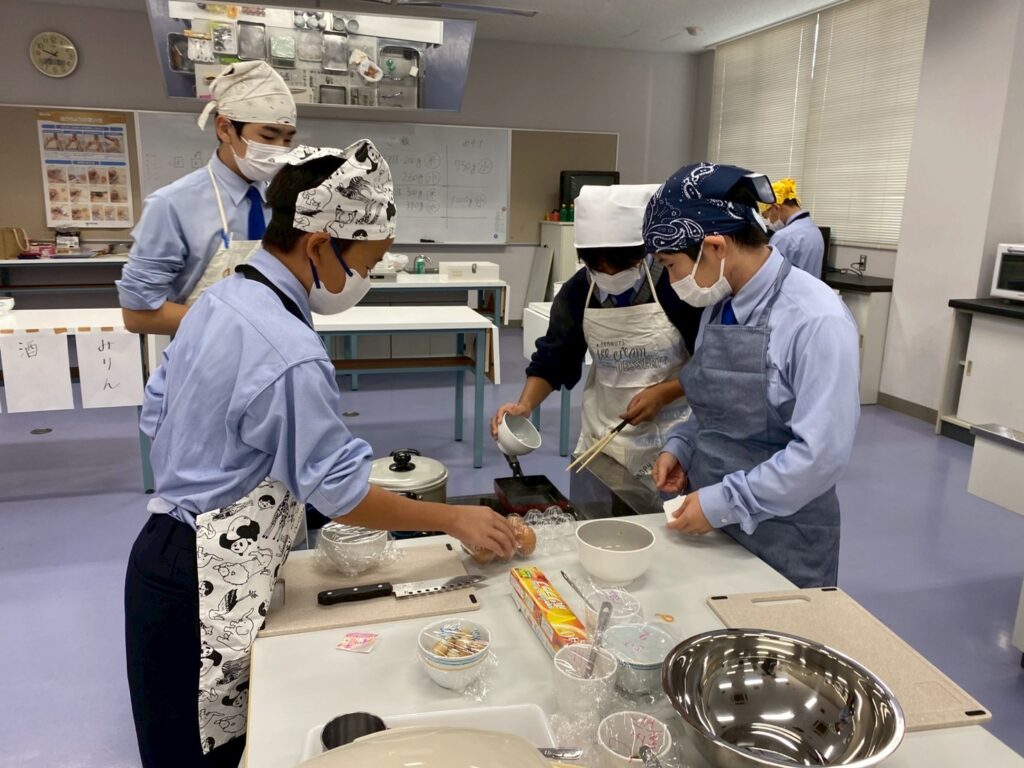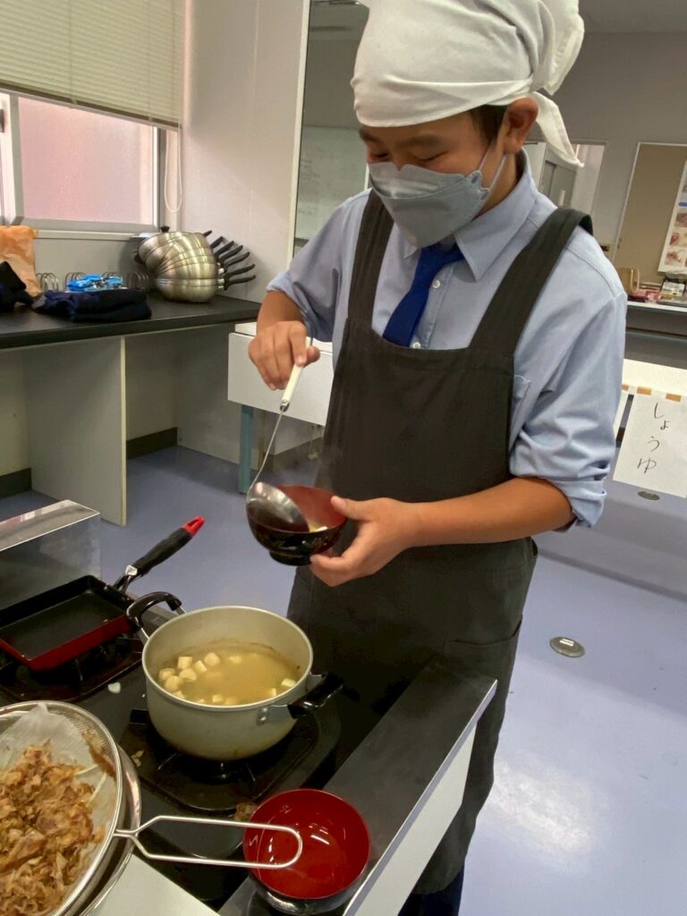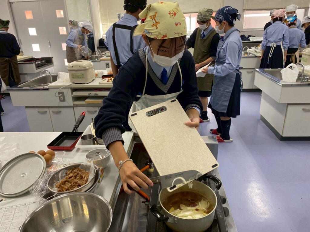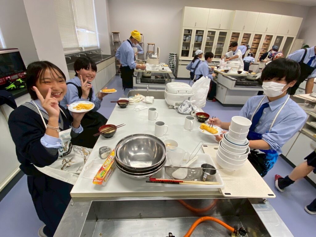 10月30日(木)に中学1年3組が調理実習を行いました。メニューは、ご飯、みそ汁、卵焼きです。クラスメイトとの調理は今回が初めてです。事前に役割分担を決めて、調理手順を予習して実習に臨みましたが・・・。卵焼きは、一人ずつ作ります。お母さんが作ってくれる卵焼きはいつも美味しくてきれいな形なのに、自分で作るとこんなにもうまくいかないものなのか・・・と実感した生徒が多かったはず。