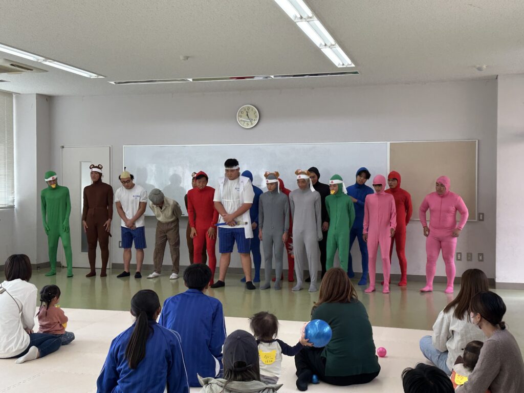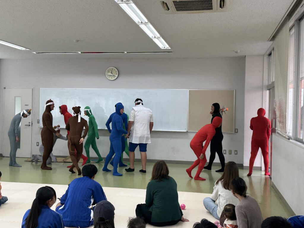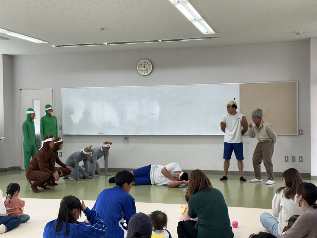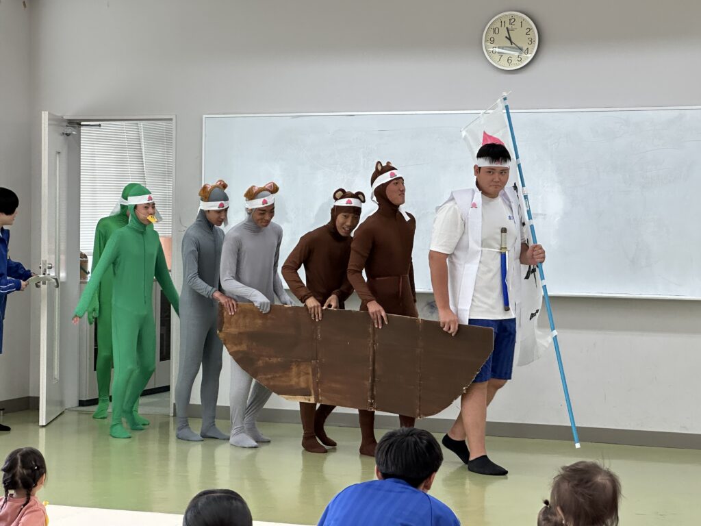 主役のももたろうは、成長に合わせて4人で演じました。ももたろうが代わるとお父さんやお母さんから笑いが。ほとんどの演者が全身タイツという、本気が伝わる劇となりました。おじいさん、おばあさんの名演技は素晴らしいと褒められました。劇の後は、ダンス「ジャンボリーミッキー」でした。みんなで耳のかちゅ