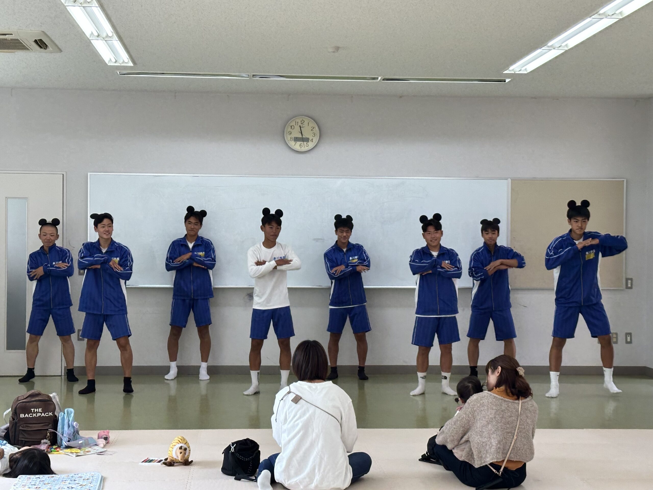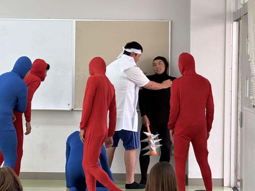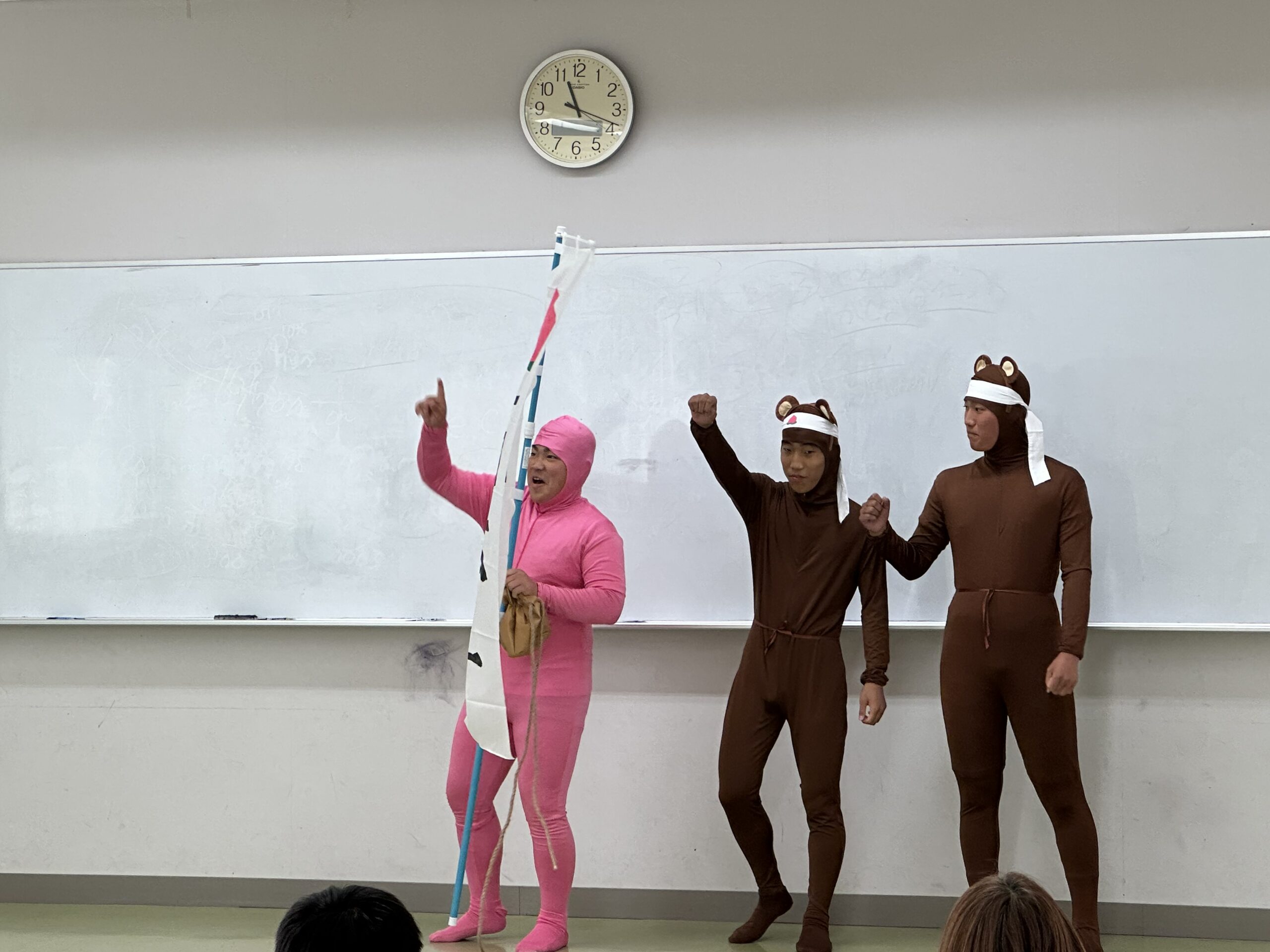 主役のももたろうは、成長に合わせて4人で演じました。ももたろうが代わるとお父さんやお母さんから笑いが。ほとんどの演者が全身タイツという、本気が伝わる劇となりました。おじいさん、おばあさんの名演技は素晴らしいと褒められました。劇の後は、ダンス「ジャンボリーミッキー」でした。みんなで耳のかちゅ