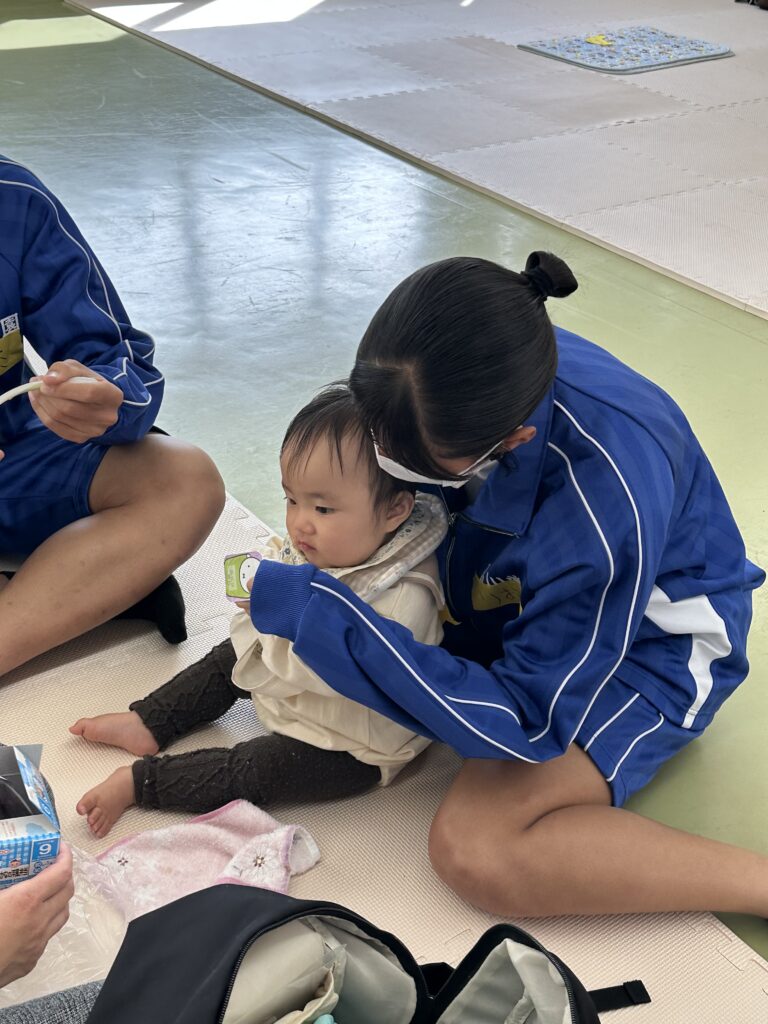 人見知りの始まった幼児とのふれあいに苦戦しいている生徒がいました。短い時間ですが、貴重な体験をすることができました。