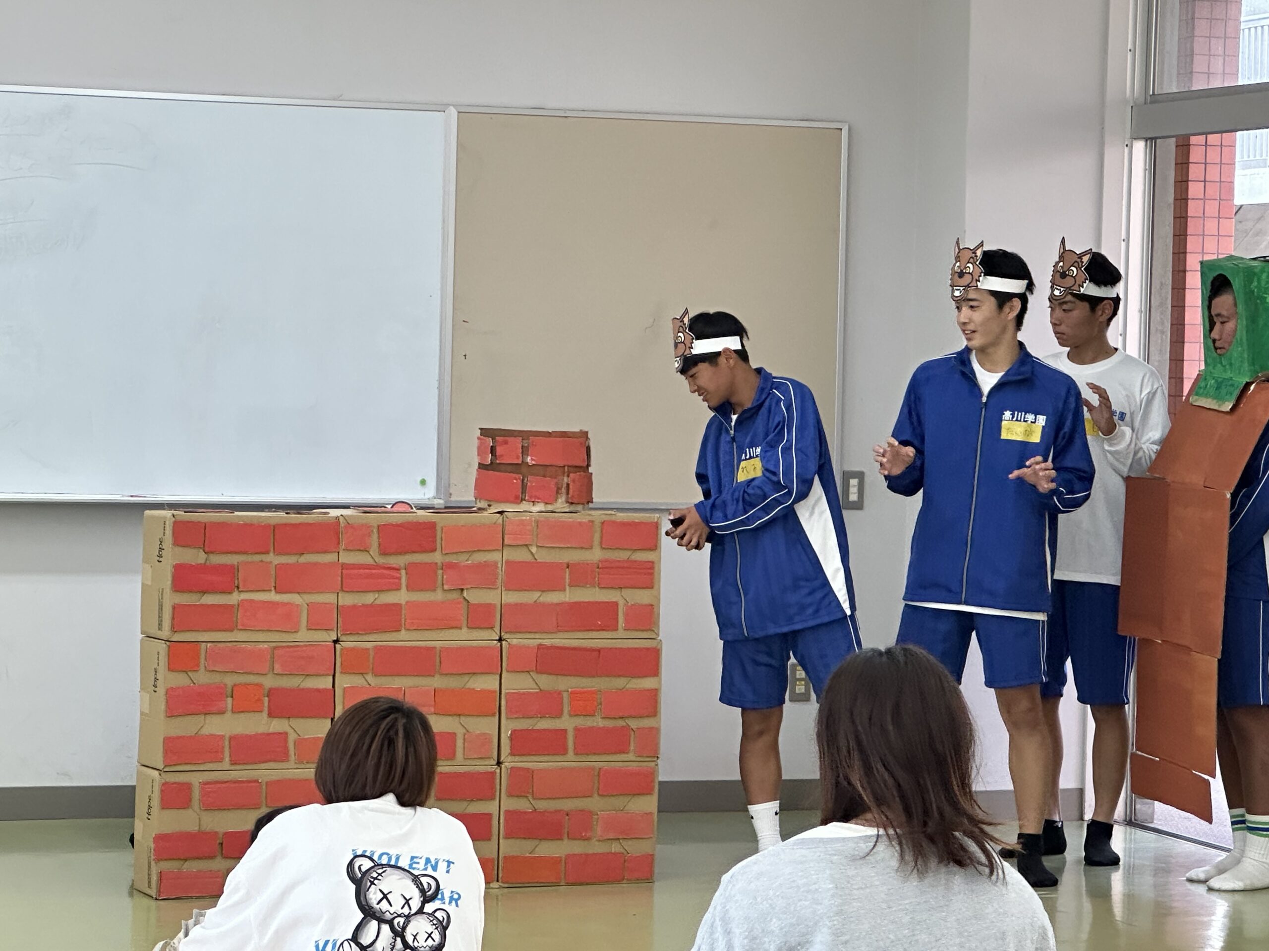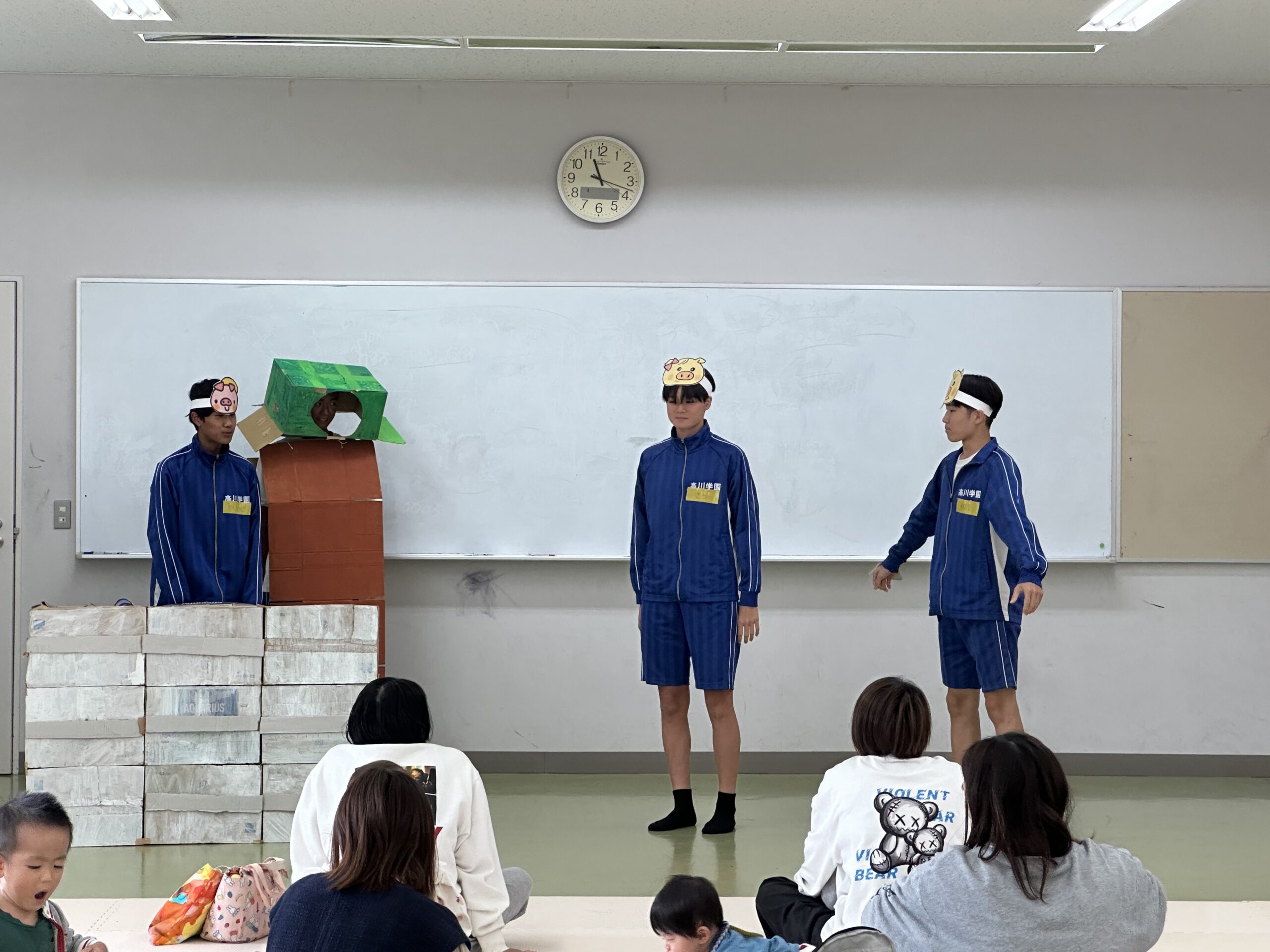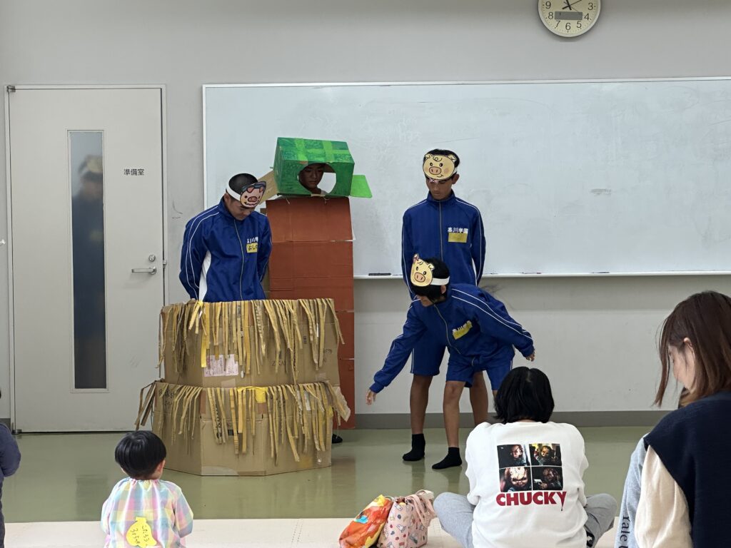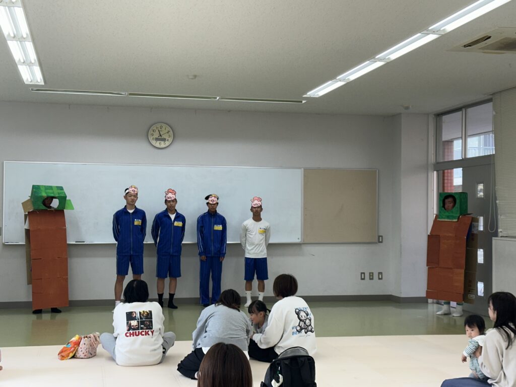 11月5日(水)に高校1年5組が乳幼児とのふれあい体験を実施しました。クラスの出し物は劇「4匹の子ぶた」でした。クラス全員が劇に参加しようということになり、「3匹の子ぶた」の台本をアレンジして挑戦しました。わらの家、木の家、レンガの家・・・そこまでは誰もが知っているお話なのですが、アレンジされたのは4匹目の一番賢い子ぶたが作った鉄の家でした。劇の後はふれあいタイムでした。あっという間の体験でした。普段の授業では見ることができない、とても豊かな表情で乳幼児と触れ合う高校生の姿を見ることができました。ご参加いただいた皆さん、ありがとうございました。