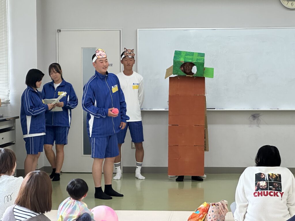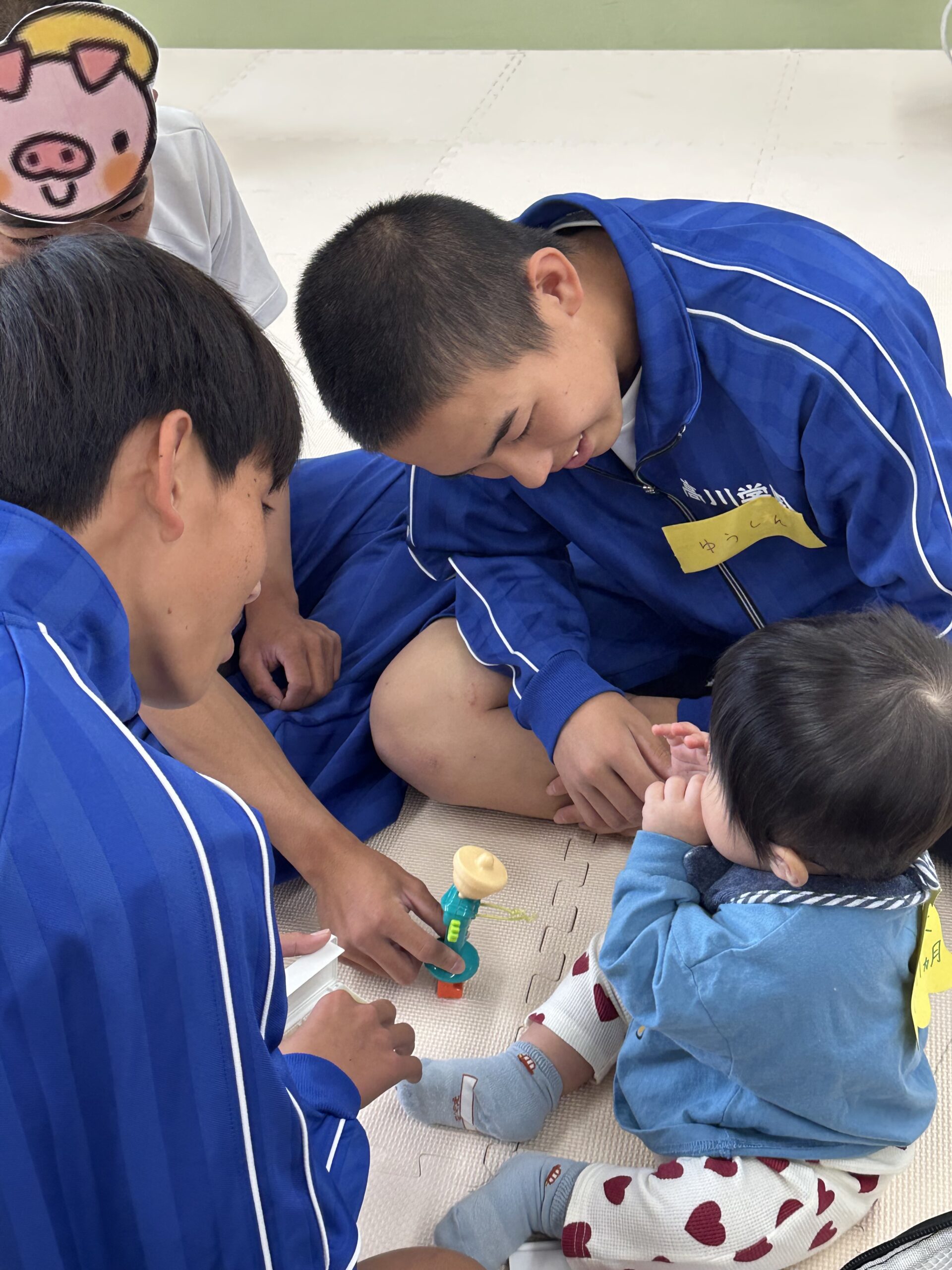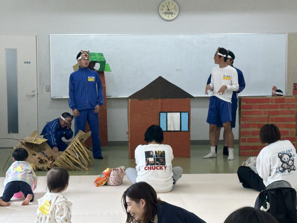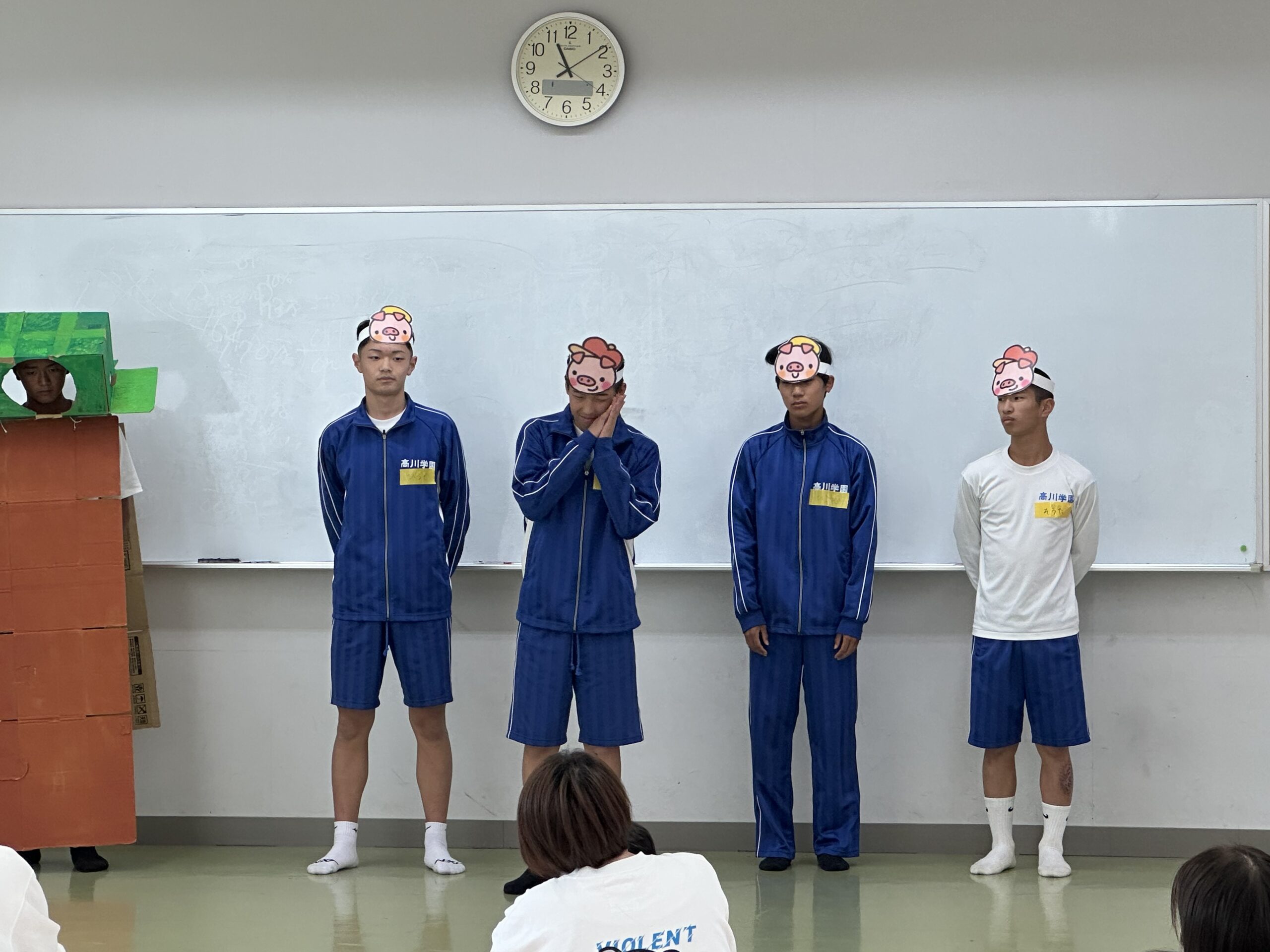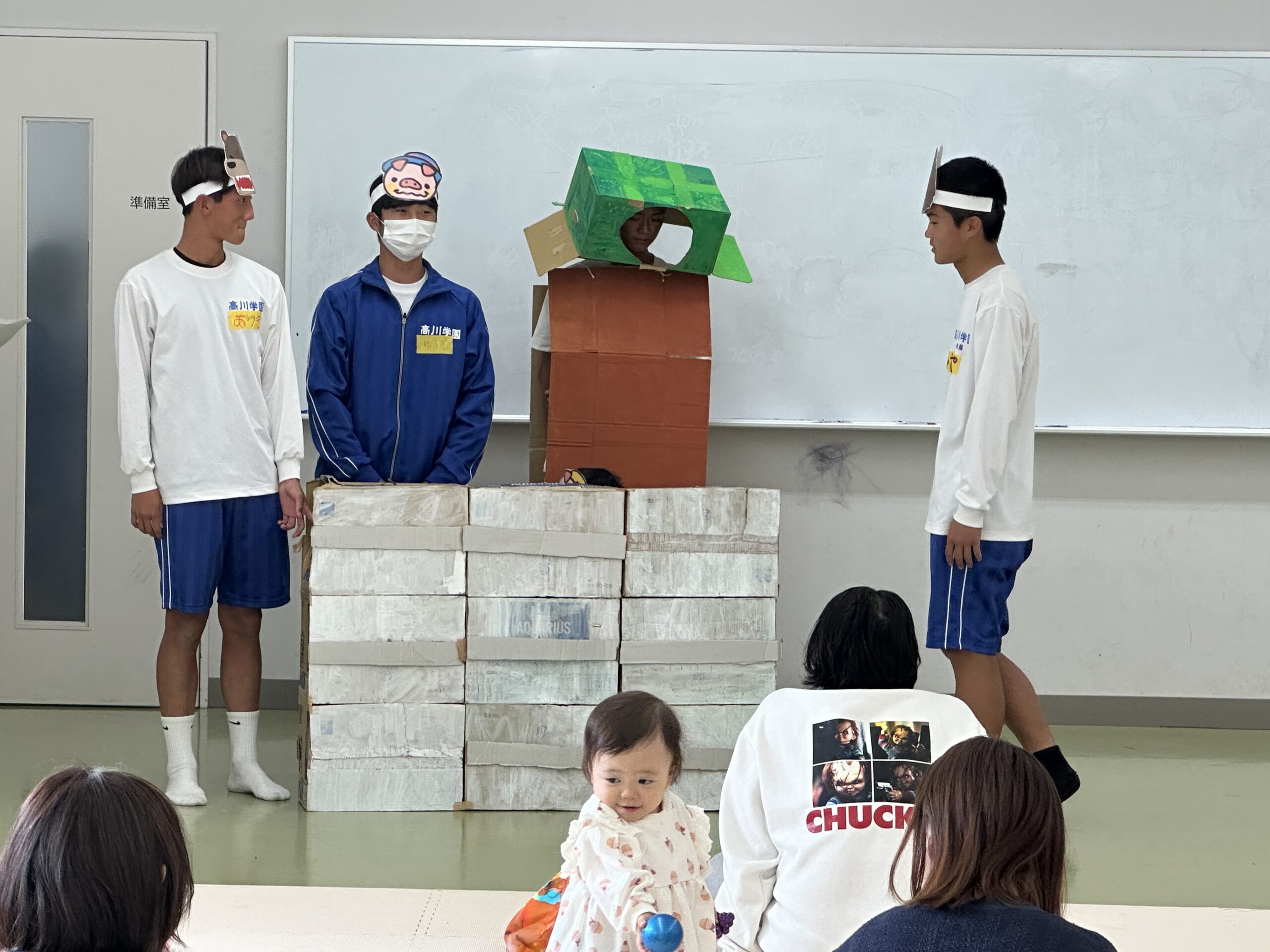 11月5日(水)に高校1年5組が乳幼児とのふれあい体験を実施しました。クラスの出し物は劇「4匹の子ぶた」でした。クラス全員が劇に参加しようということになり、「3匹の子ぶた」の台本をアレンジして挑戦しました。わらの家、木の家、レンガの家・・・そこまでは誰もが知っているお話なのですが、アレンジされたのは4匹目の一番賢い子ぶたが作った鉄の家でした。劇の後はふれあいタイムでした。あっという間の体験でした。普段の授業では見ることができない、とても豊かな表情で乳幼児と触れ合う高校生の姿を見ることができました。ご参加いただいた皆さん、ありがとうございました。