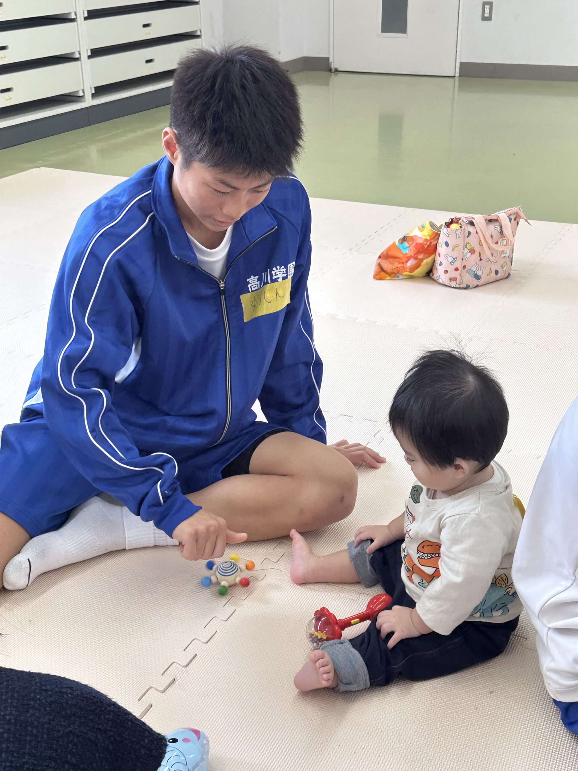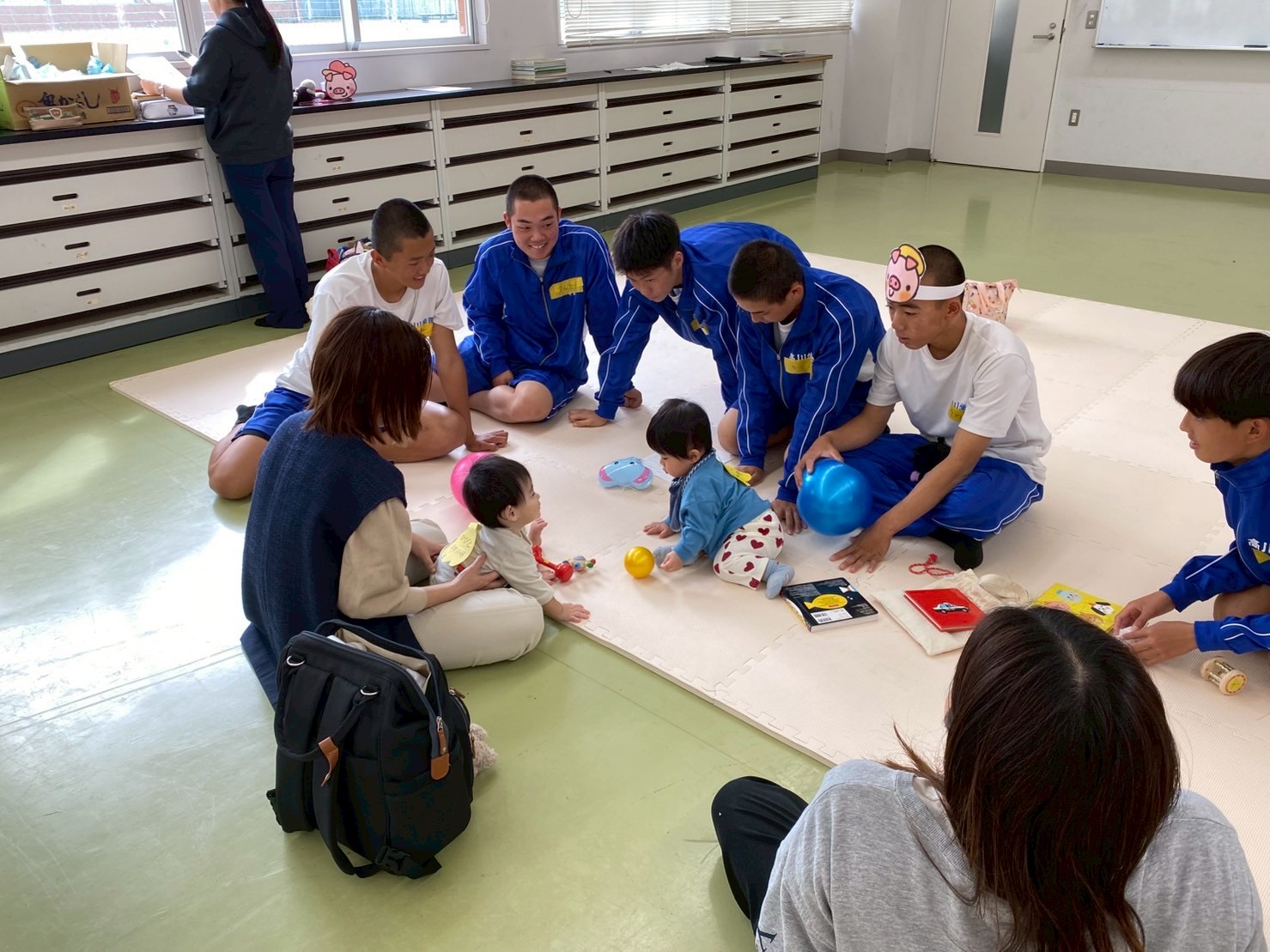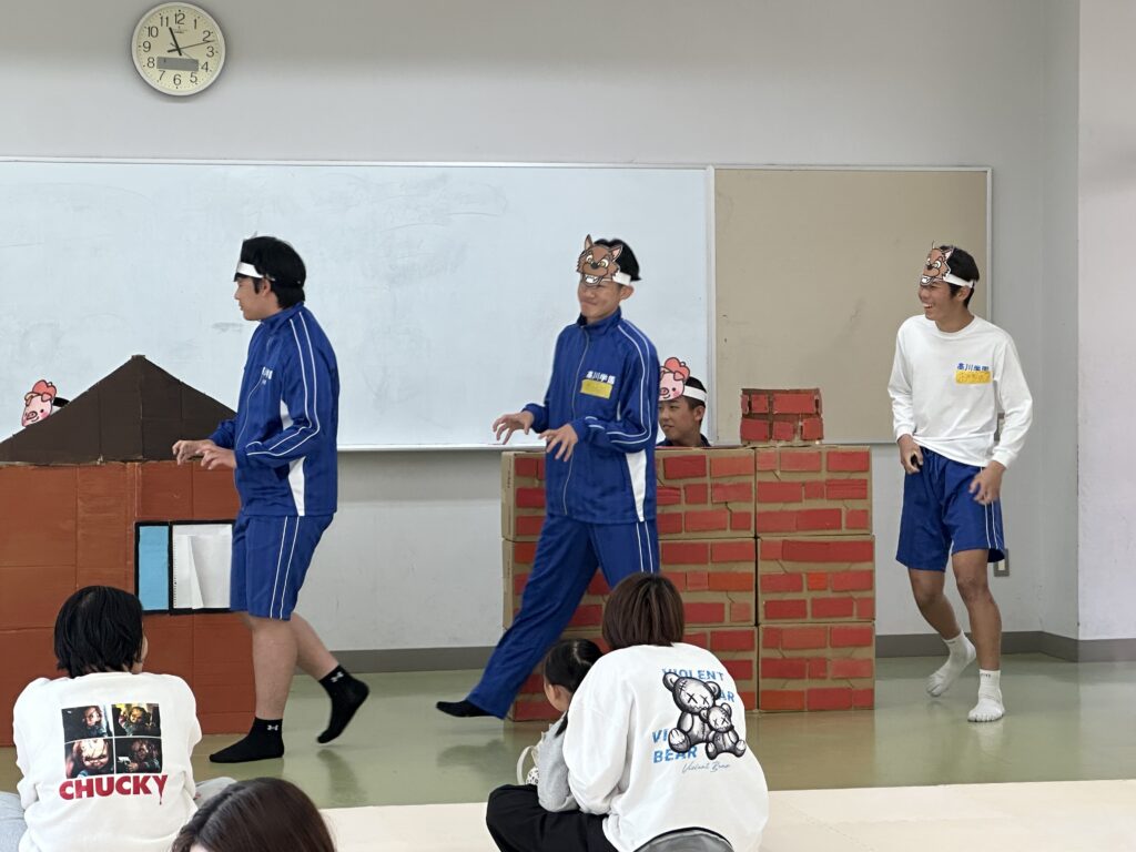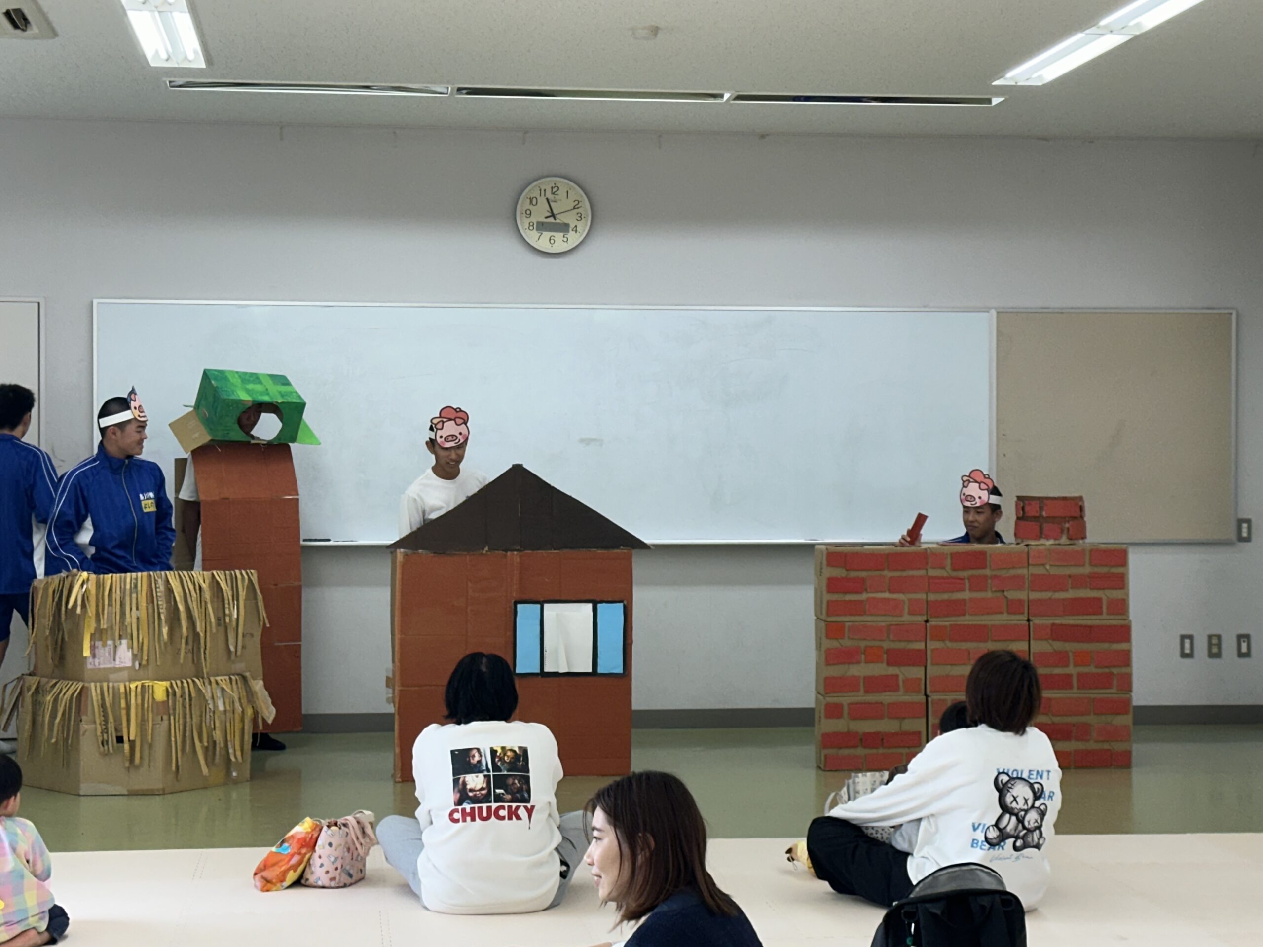 11月5日(水)に高校1年5組が乳幼児とのふれあい体験を実施しました。クラスの出し物は劇「4匹の子ぶた」でした。クラス全員が劇に参加しようということになり、「3匹の子ぶた」の台本をアレンジして挑戦しました。わらの家、木の家、レンガの家・・・そこまでは誰もが知っているお話なのですが、アレンジされたのは4匹目の一番賢い子ぶたが作った鉄の家でした。劇の後はふれあいタイムでした。あっという間の体験でした。普段の授業では見ることができない、とても豊かな表情で乳幼児と触れ合う高校生の姿を見ることができました。ご参加いただいた皆さん、ありがとうございました。