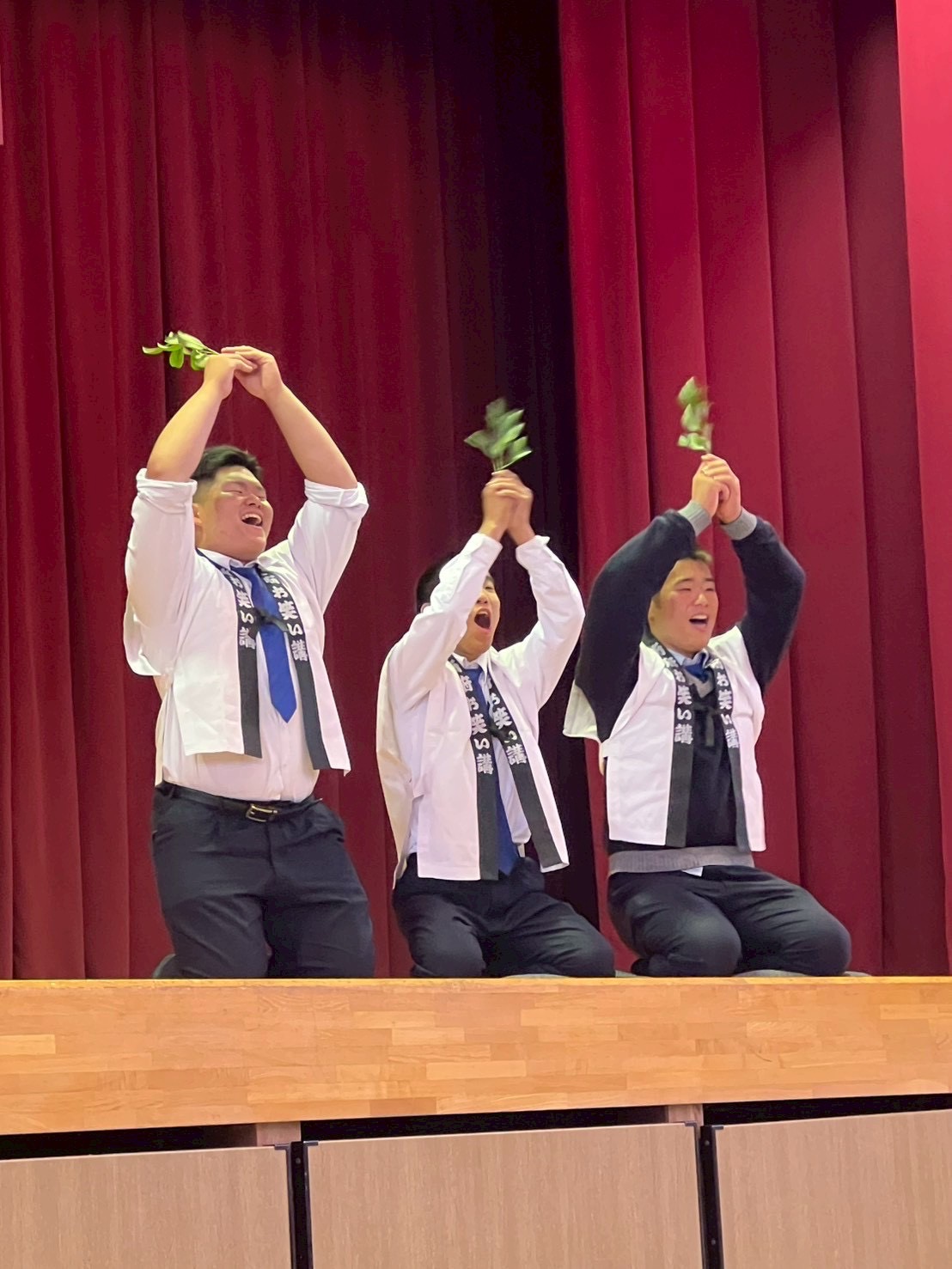 午後からは、大道お笑い講選手権大会が行われ、柔道部とソフトボール部がエントリーしました。「笑い講」とは、昔から防府市大道小俣地区に伝わる神事で、防府市の無形民俗文化財に指定されています。毎年12月に小俣八幡宮で行われている笑いの神事で、榊を手に「わっはっは」と3回笑い、今年の収穫の感謝と来年の豊作を祈り、1年の憂さを豪快に笑い飛ばす年忘れのお祭りです。大道まつりでは、地元の人を募って大会を開いていて、今年は学園の生徒がグループを作って参加しました。
