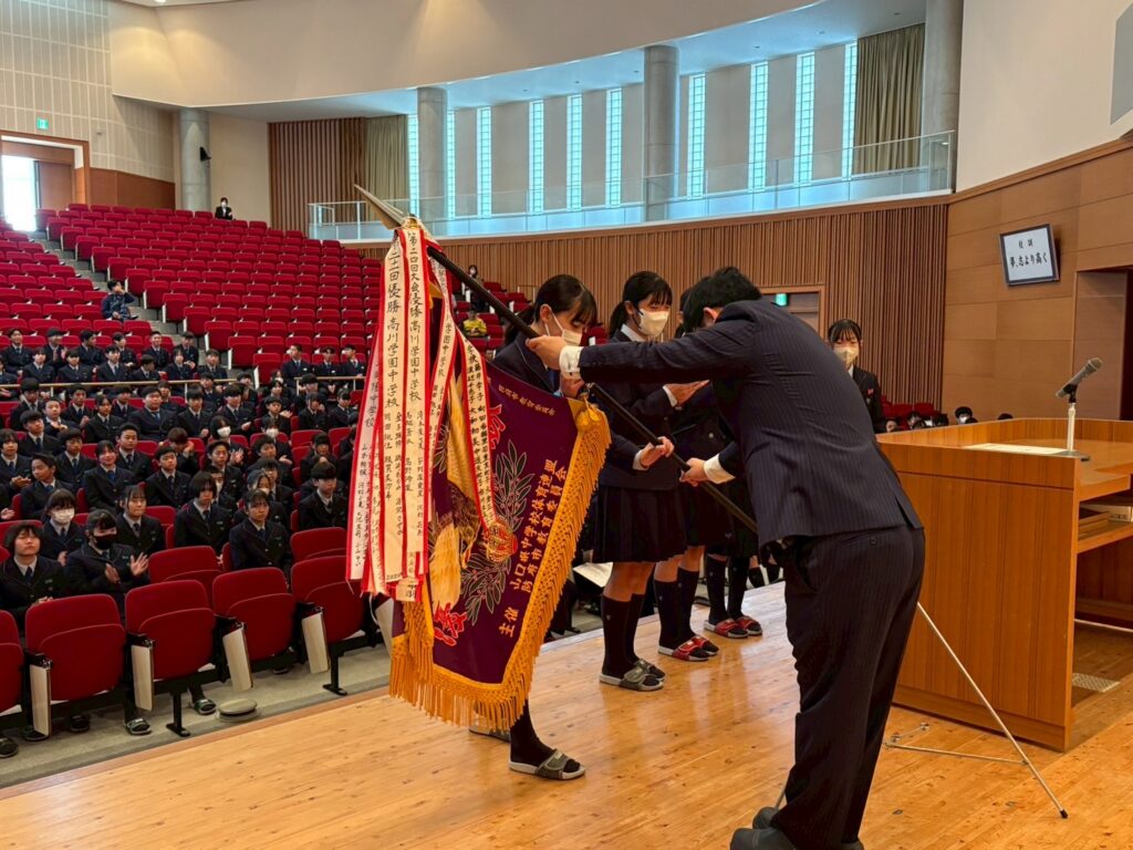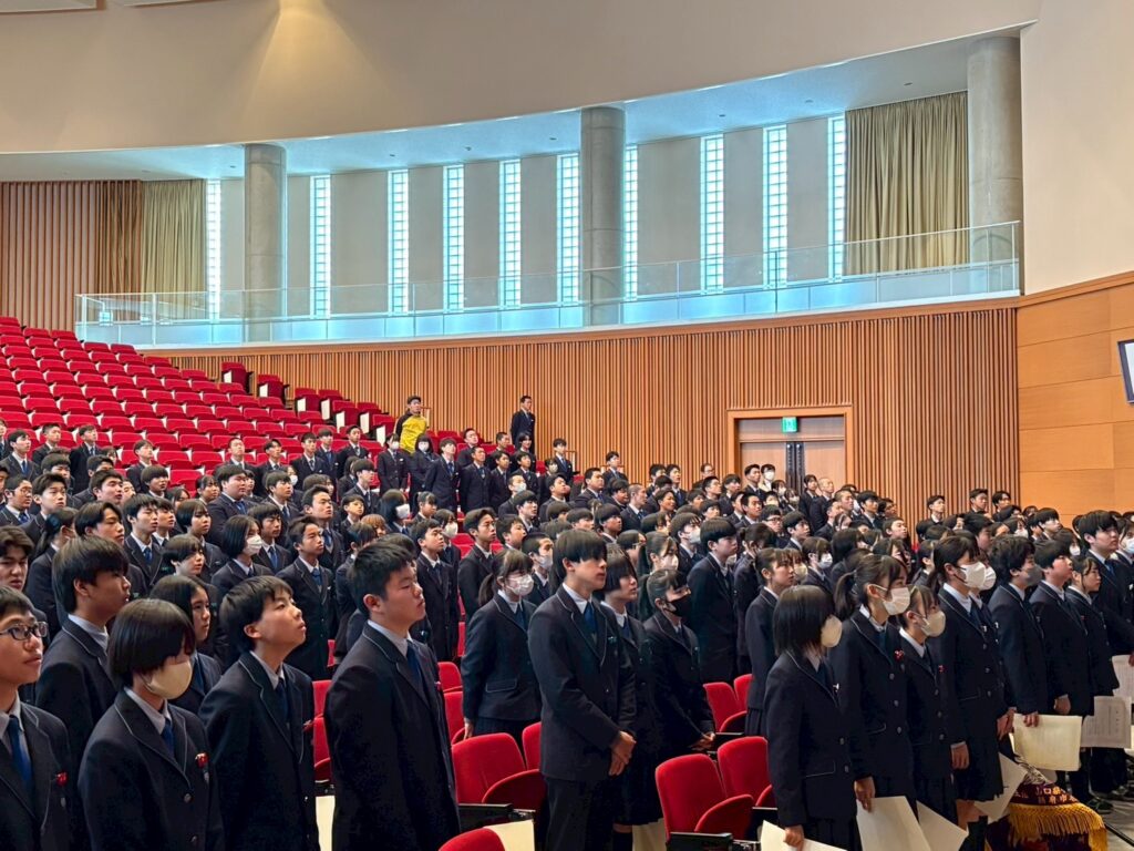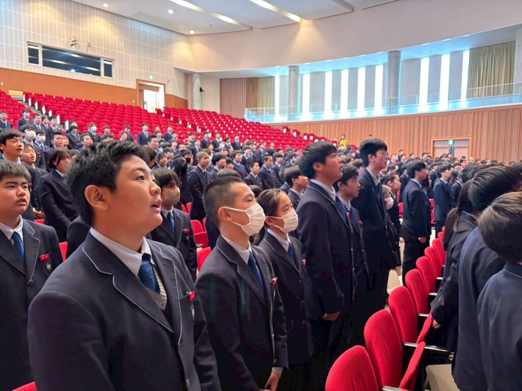 おはようございます。寒いので、私は背中を丸めがちですが、皆さんは若いから背筋がシャキッとしていますね。たくさん賞状をもらって素晴らしい活躍ですね。駅伝女子はみんなマスク姿で、全国への意気込みを感じます。バスケットボール部はウインターカップはなかなか出られない大会です。色々な部が活躍していて楽しみです。あっという間に今年も残り1カ月半、11月半ばになりました。中学生はQ1日1日大きく変化を遂げます。3年間で30センチ身長が伸びた話を聞いたことがあります。体が成長すると同時に心も変化する心身のバランスを取るのが非常に難しい時期でもあります。学園の先生は、担任、教科担任、顧問の先生の熱い指導の中で立派に成長していると思います。高校生は、この冬、男子バレー、男女サッカー、ラグビーが全国に行きます。硬式野球も春のセンバツにほぼ間違いなく出場します。毎日のようにメディアに取り上げられています。来週の木曜は卒業生、立石くん、林くん、中山くん、徳若くん4名が学園で記者会見を開きます。特に、地元の子が中高6年間学園で鍛えられて今回のように注目されるのは、素晴らしいことです。6年間プロになる為に頑張った人もいれば、高校から特別進学で勉強中心で頑張る人もいます。医学部に入る為に、途中からサッカー部を休部して現役で合格した子もいれば、硬式野球部を休部して現役で九州大学に行った子もいます。現在学業クラスで頑張っている生徒は、ぜひ高校では特別進学で頑張ってほしい。特別進学クラスは、今年度から教室が実習棟(現進学棟)に移りました。特別進学棟は特別感のある環境です。通常クラスと違って広々とした教室で、机が通常クラスの倍の大きさです。特別な環境で学業の先取りをして学べば、大学受験にとても有利です。文武両道ができる環境は素晴らしいと思います。熱い先生にしっかり鍛えてもらいましょう。
