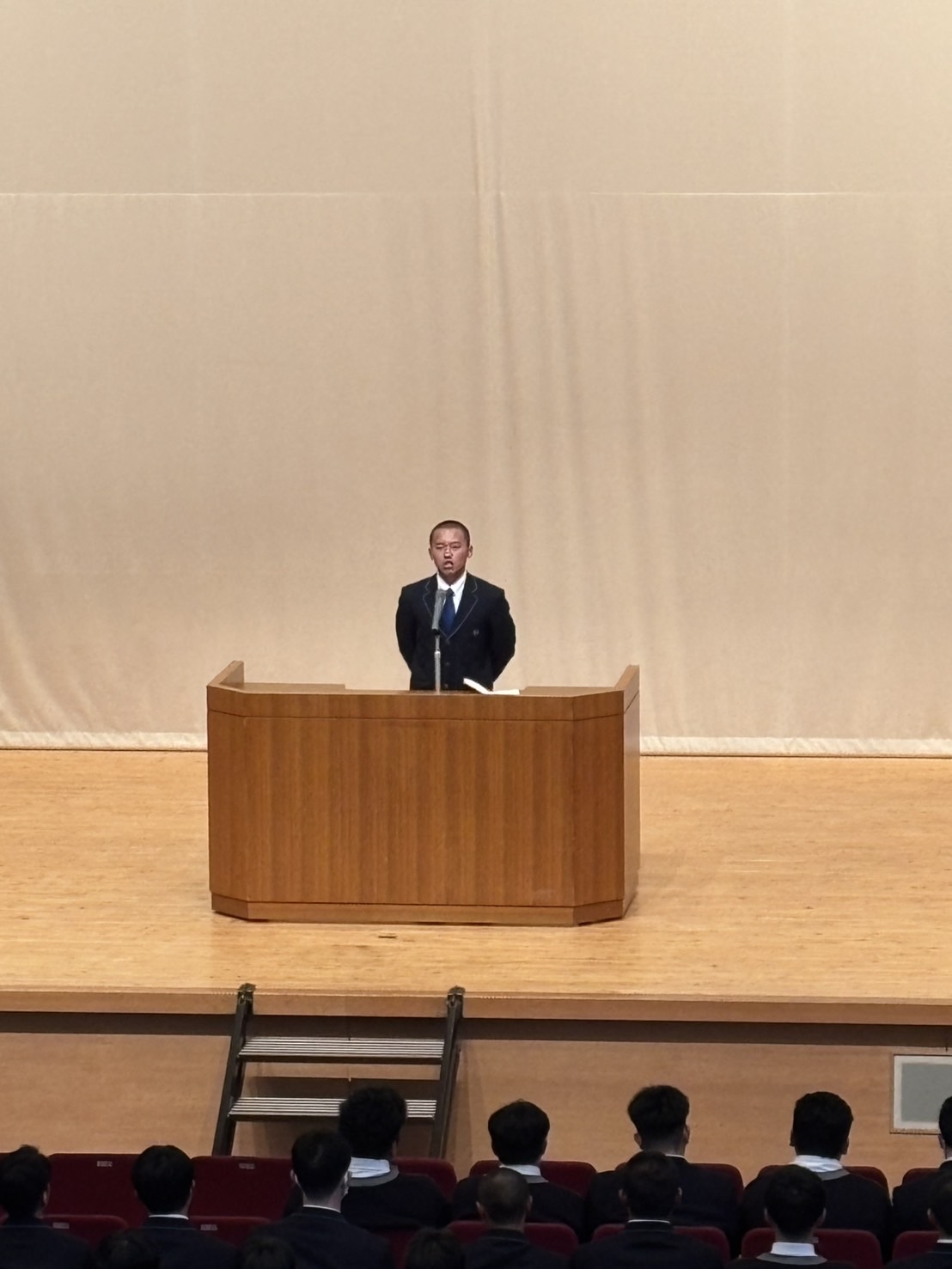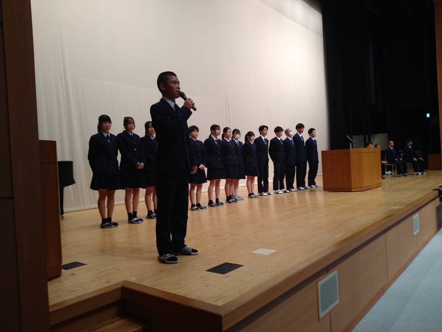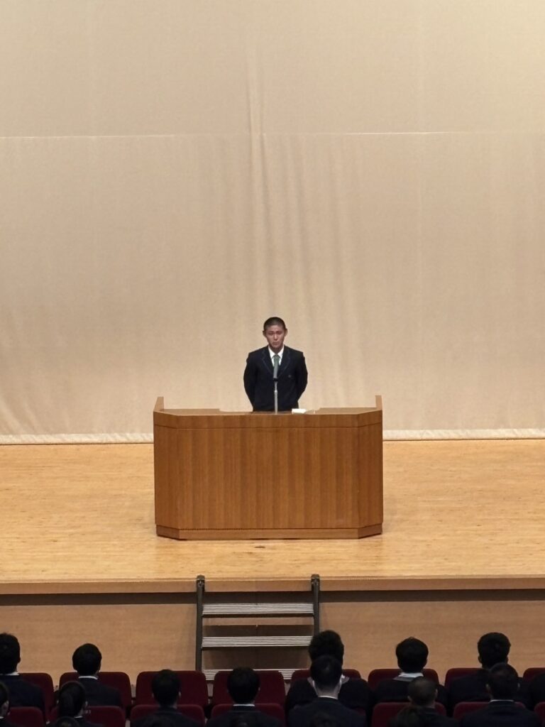 新生徒会長は立候補者が1名だったので決意表明をしました。次期生徒会長は 2年生 東柊和くんが務めることになりました。