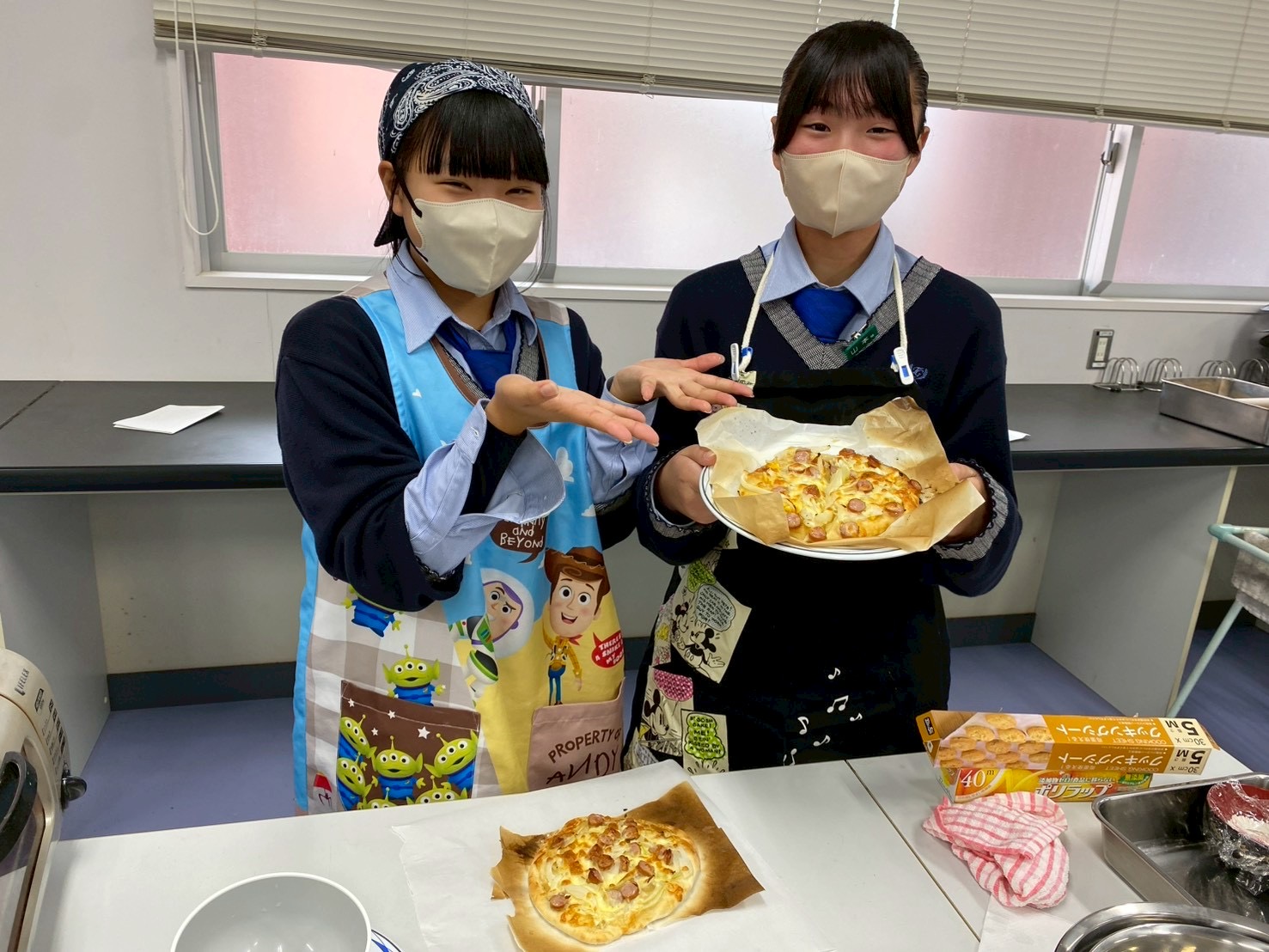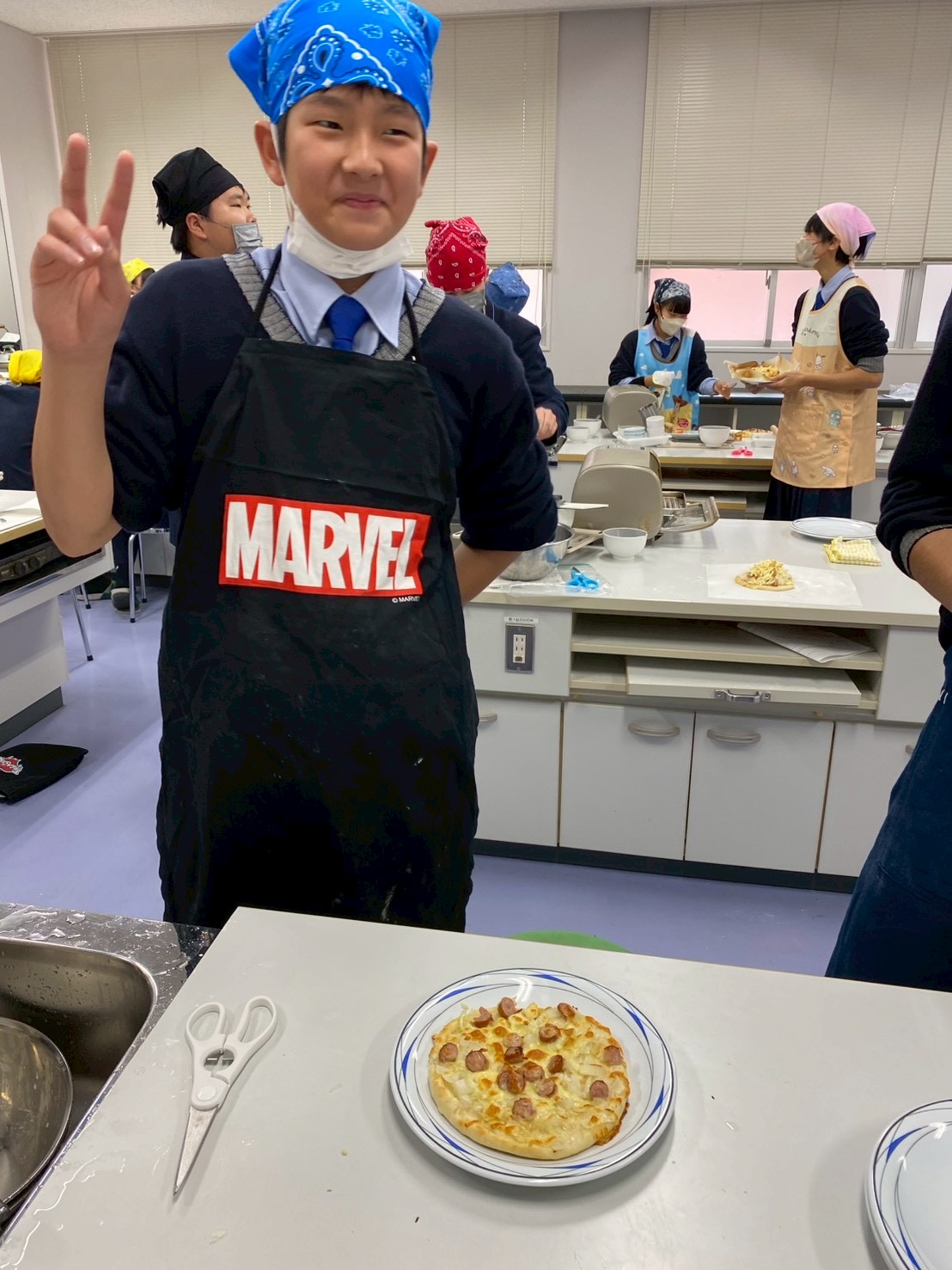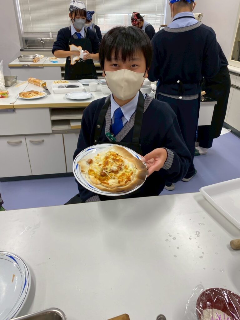 12月10日(水)に中学2年3組が調理実習を行いました。2年生が挑戦するのは、ピザです。各自で生地から作ります。自分の食べるピザを自分で作るので、具材も各自で切ります。切る時の手つきが危ない人がいてヒヤヒヤ、切った玉ねぎが飛んで行ってびっくり。ハプニングがありましたが、みんな美味しそうに完成しました。味はどうだったでしょう・・・?