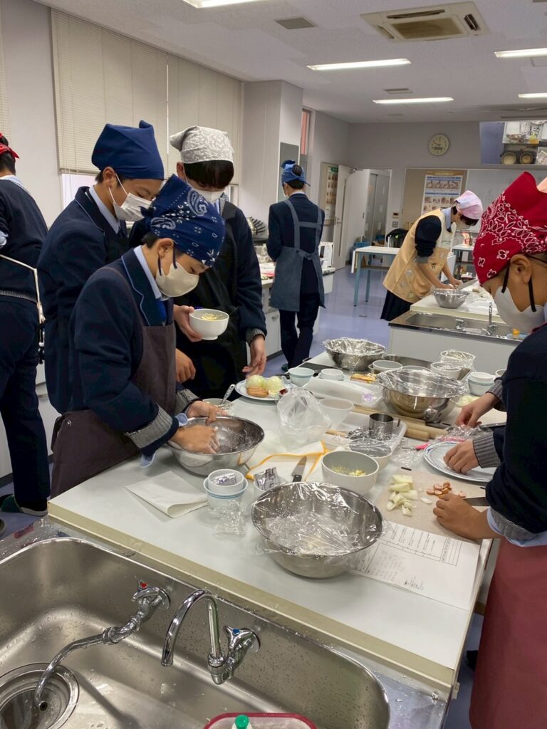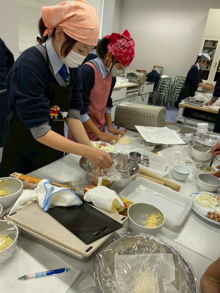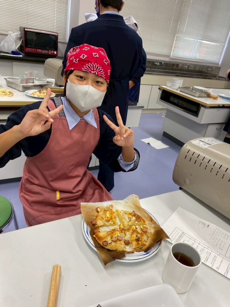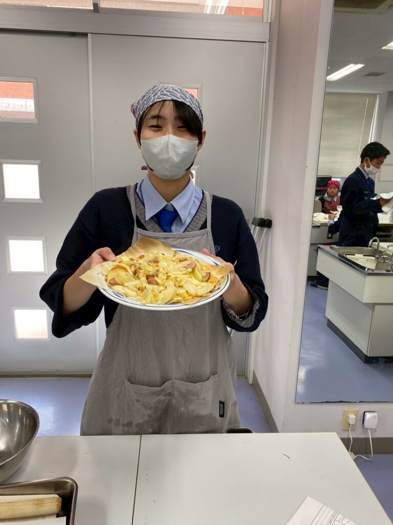 12月10日(水)に中学2年3組が調理実習を行いました。2年生が挑戦するのは、ピザです。各自で生地から作ります。自分の食べるピザを自分で作るので、具材も各自で切ります。切る時の手つきが危ない人がいてヒヤヒヤ、切った玉ねぎが飛んで行ってびっくり。ハプニングがありましたが、みんな美味しそうに完成しました。味はどうだったでしょう・・・?