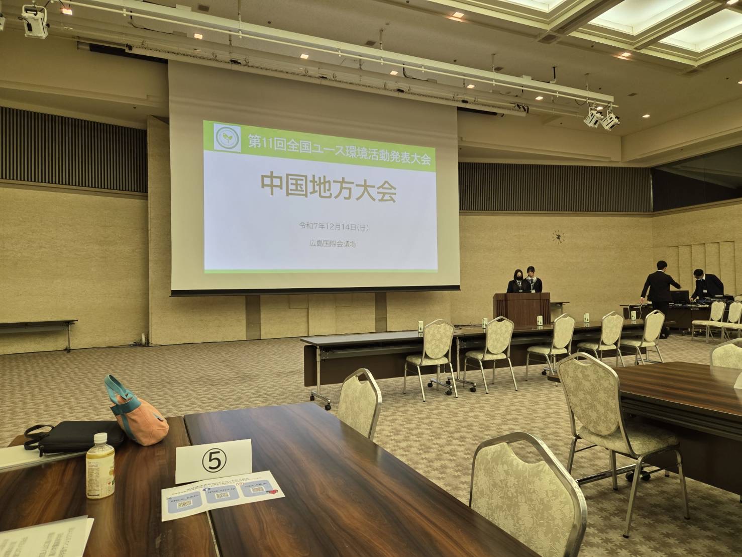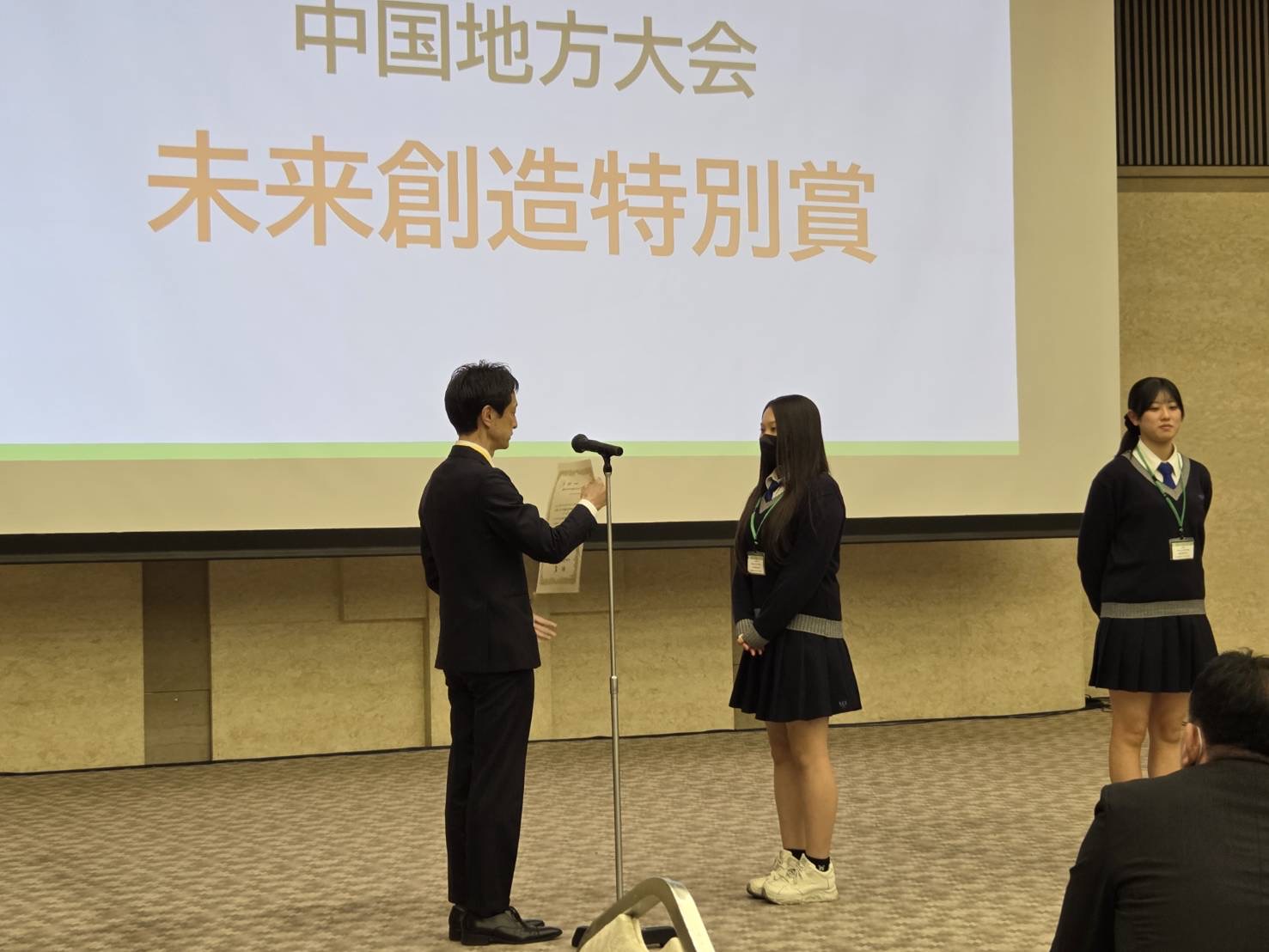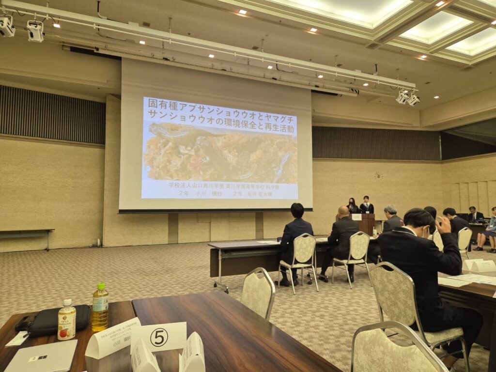 12月14日(日)広島県平和公園内広島国際会議場にて第11回全国ユース環境活動発表大会中国地区大会が行われました。環境省・独立行政法人環境再生保全機構・国連大学サステイナビリティ高等研究所が主催しており、全国各地で社会問題解決のために活動している高校生の事例を発表する大会です。本校からは科学部オオサンショウウオ班が参加しました。「山口県産サンショウウオの保護区制定に向けての研究活動」と称して、種の保存法により希少種を守る実践報告をしました。審査の結果、未来創造特別賞をいただきました。保護活動はまだまだ続きます。後輩たちにしっかり引き継いでほしいと思います。