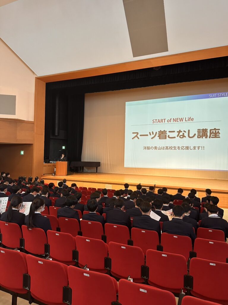 1月9日(金)3時間目に、高校3年生を対象にスーツ着こなし講座が開かれました。今回は洋服の青山から講師の方が来られました。第一印象の良さは、身だしなみの良さで決まると思います。学んだ内容をしっかりと生かしてかっこよくスーツを着こなしましょう。