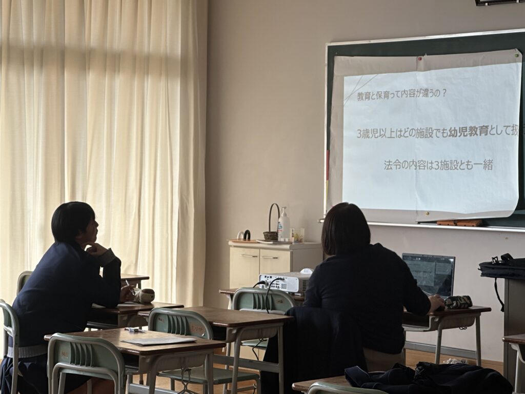 事前調査で興味があると答えた職種に就くことができる専門学校や大学などから講師の方にお越しいただき、仕事の内容やその職業に就くための進路などの説明を聞きました。例えば、高校卒業でも大学卒業でも公務員になれますが、採用試験や就職後の収入にどのような違いがあるかなど、詳しく知ることができました。高校2年生からはコース選択をしてより進路に合わせた学習内容になります。今のうちからしっかり考えたいですね。