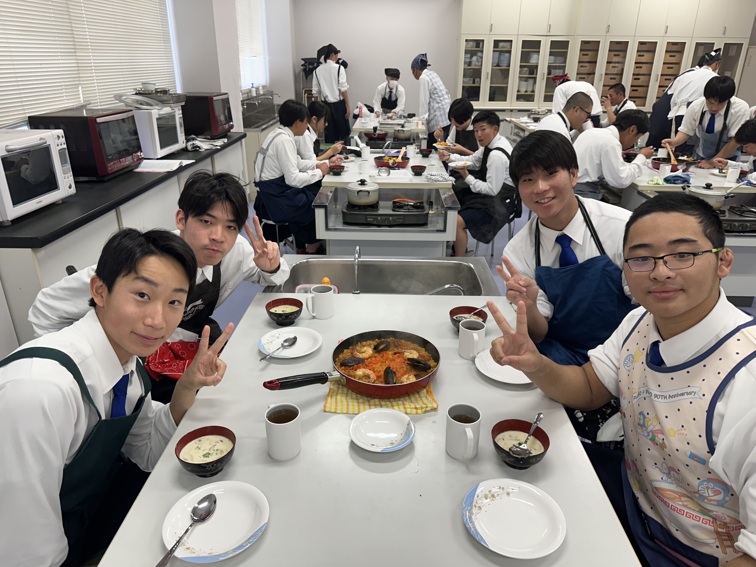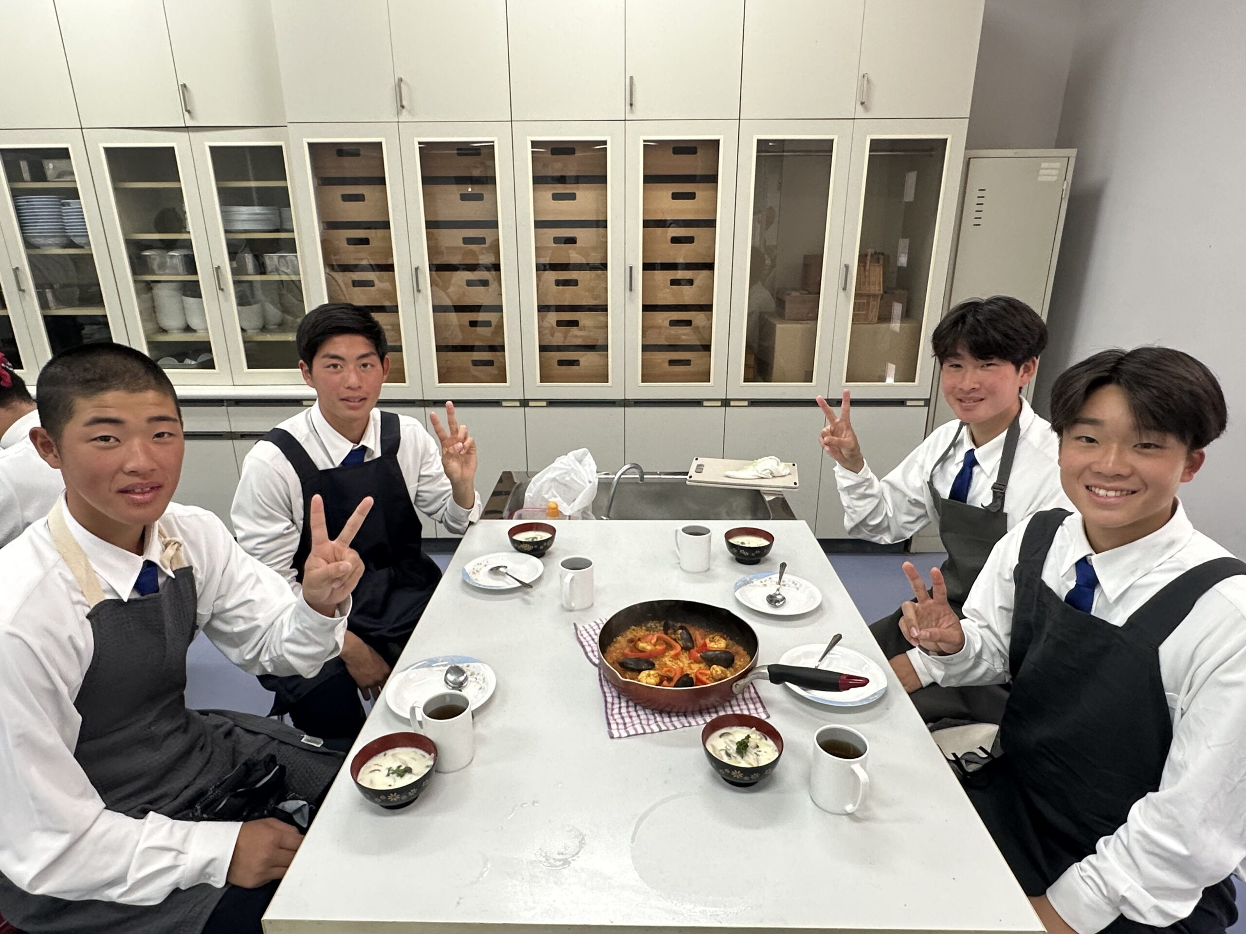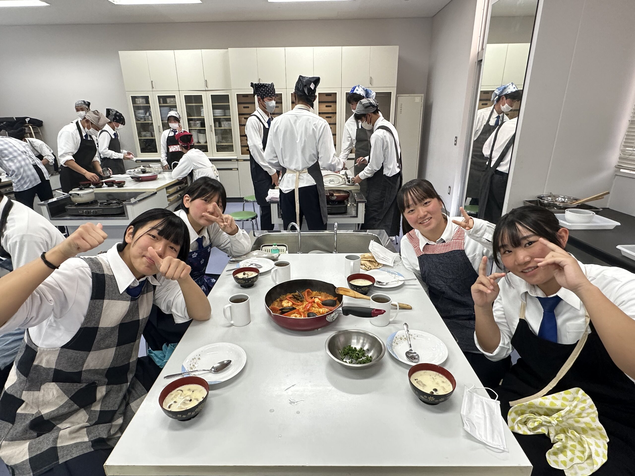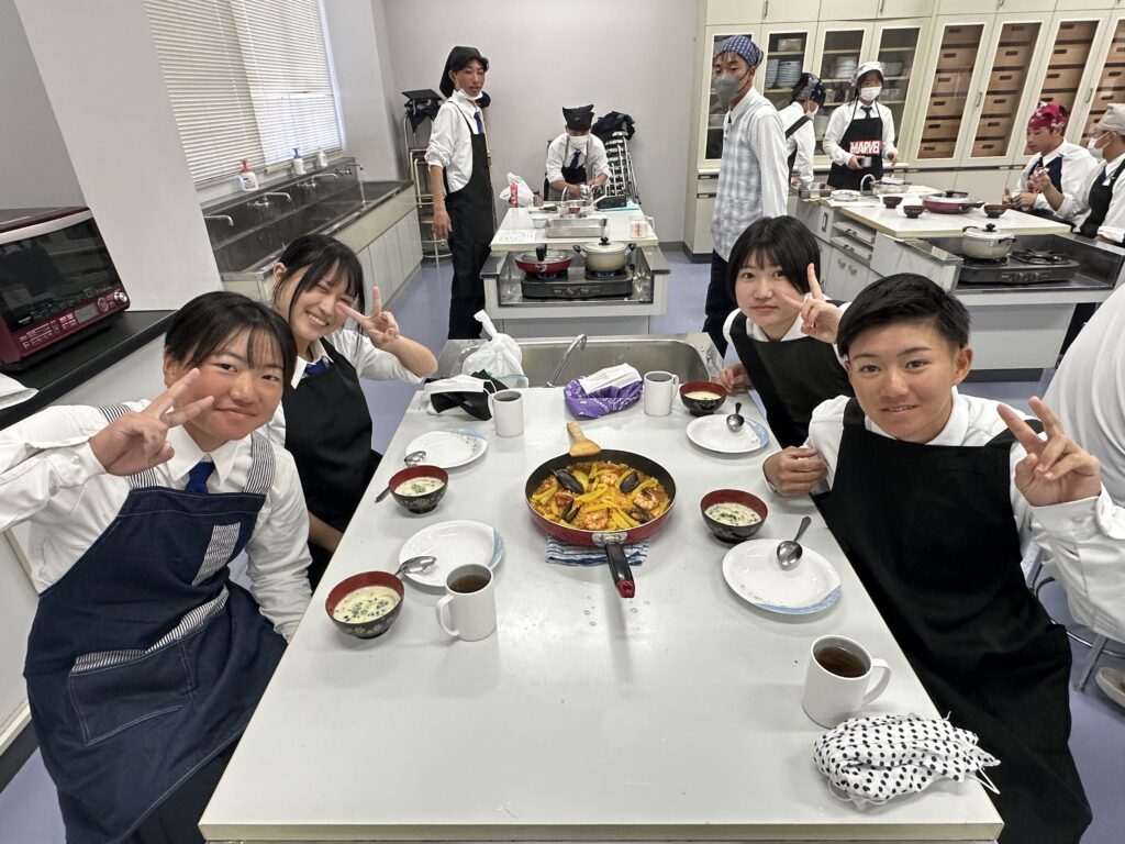 1月26日(月)に高校1年6組が調理実習をしました。他のクラス同様「シーフードパエリア」と「ベーコンときのこのミルクスープ」でした。スープは具材を炒めるのですが、「鍋を熱してバターを入れて溶かし・・・」のはずが、入れた瞬間に黒焦げに・・・という班が・・・。事前に注意事項を説明していましたが、覚えていなかったようで・・・。やり直しになる班がありましたが、何とか無事に完成しました。残念ながらお米に芯が残っている班がありましたが、みんなで楽しく作って食べることができたので良かったですね。次は成功目指して自宅でチャレンジしてみましょう!