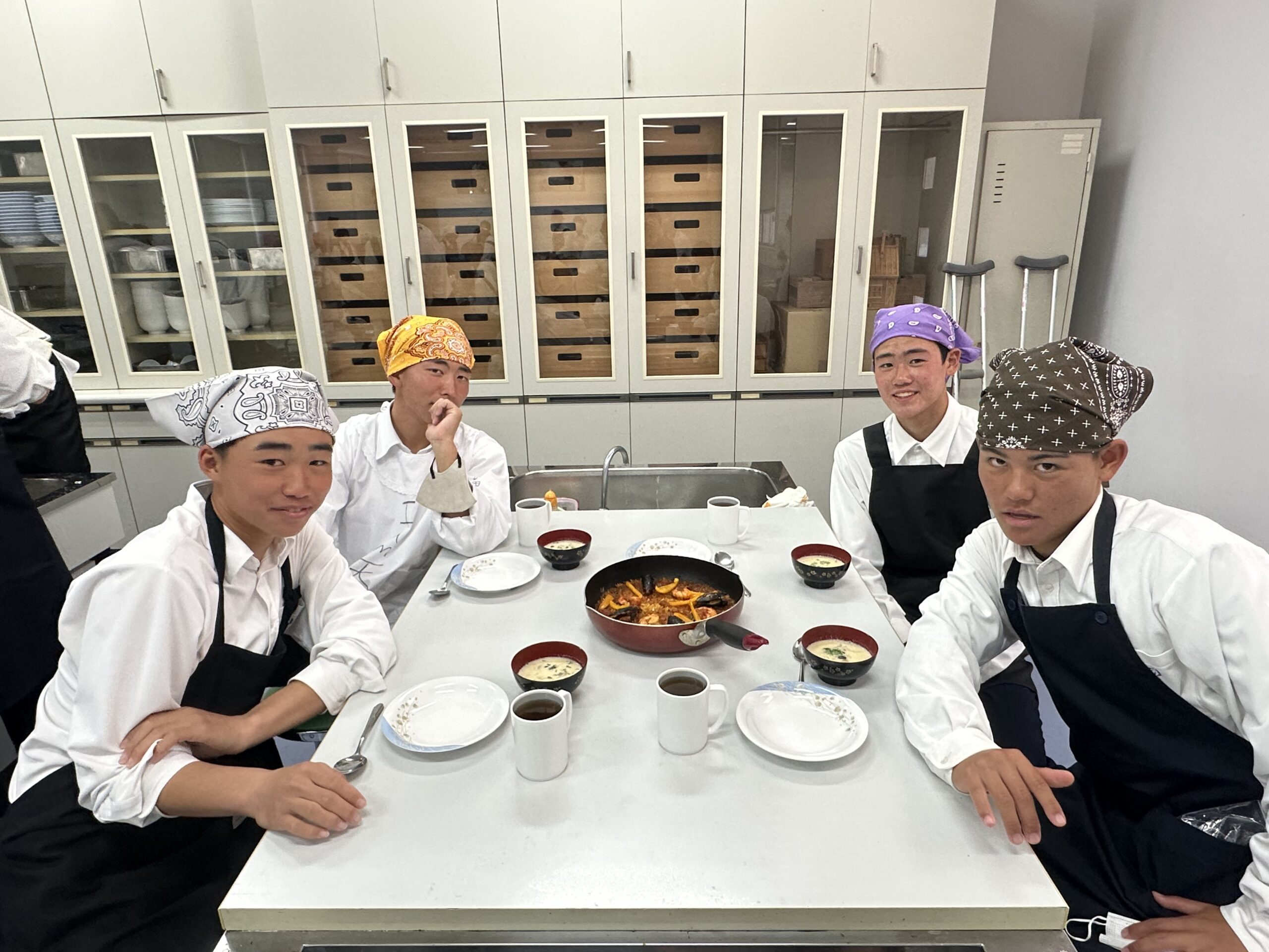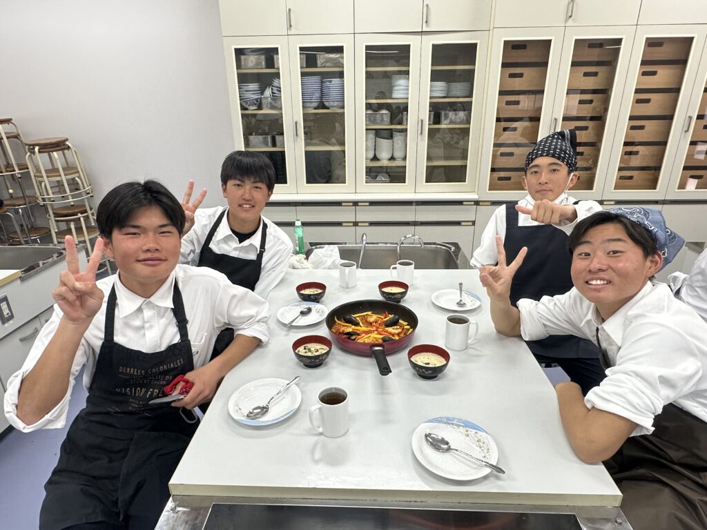 炒めて煮込みます。「シーフードを煮込む時はローリエを半分に折って加える」のですが、忘れてそのまま入れてしまって、慌てて取り出す場面が。せっかくの殻付きムール貝を殻から出してしまった班も・・・。色々ハプニングがありましたが、協力して完成しました!来週も頑張るぞ!