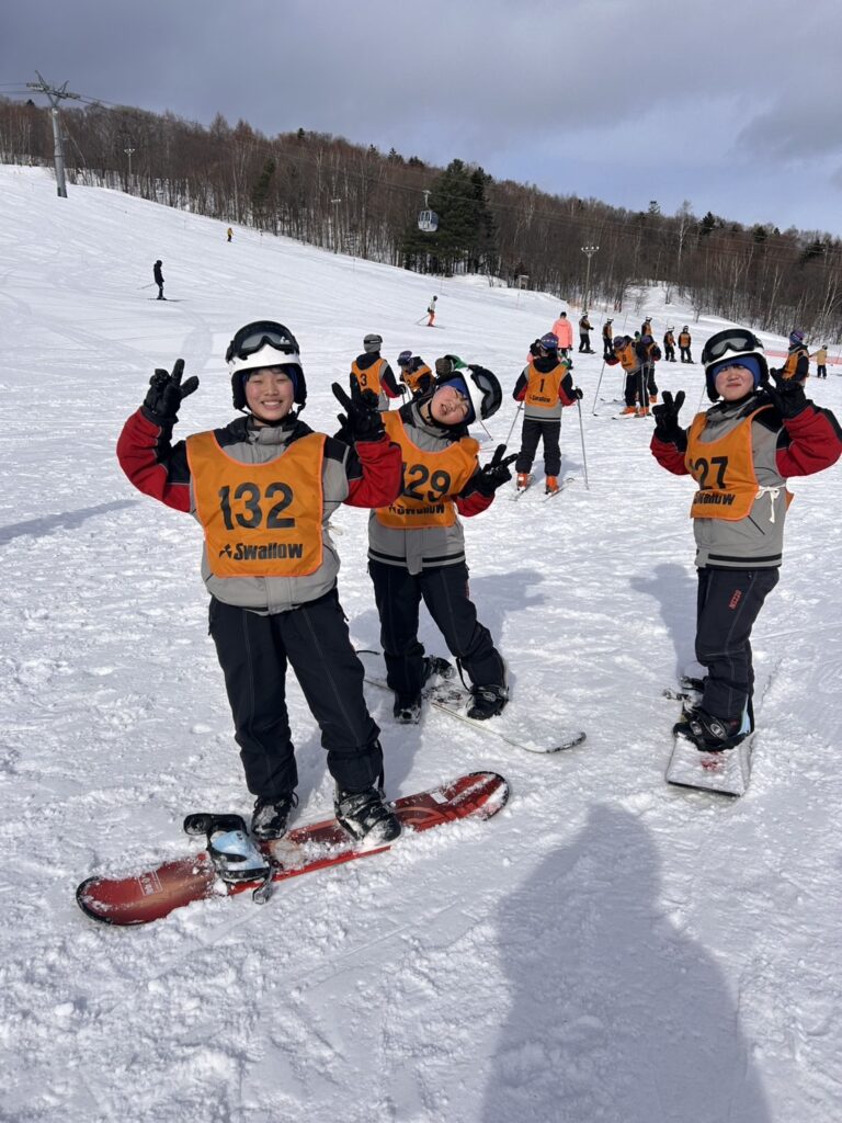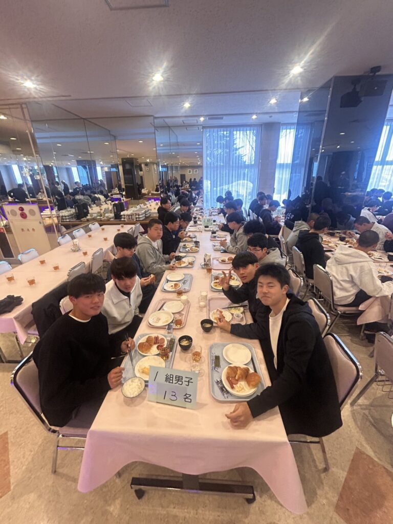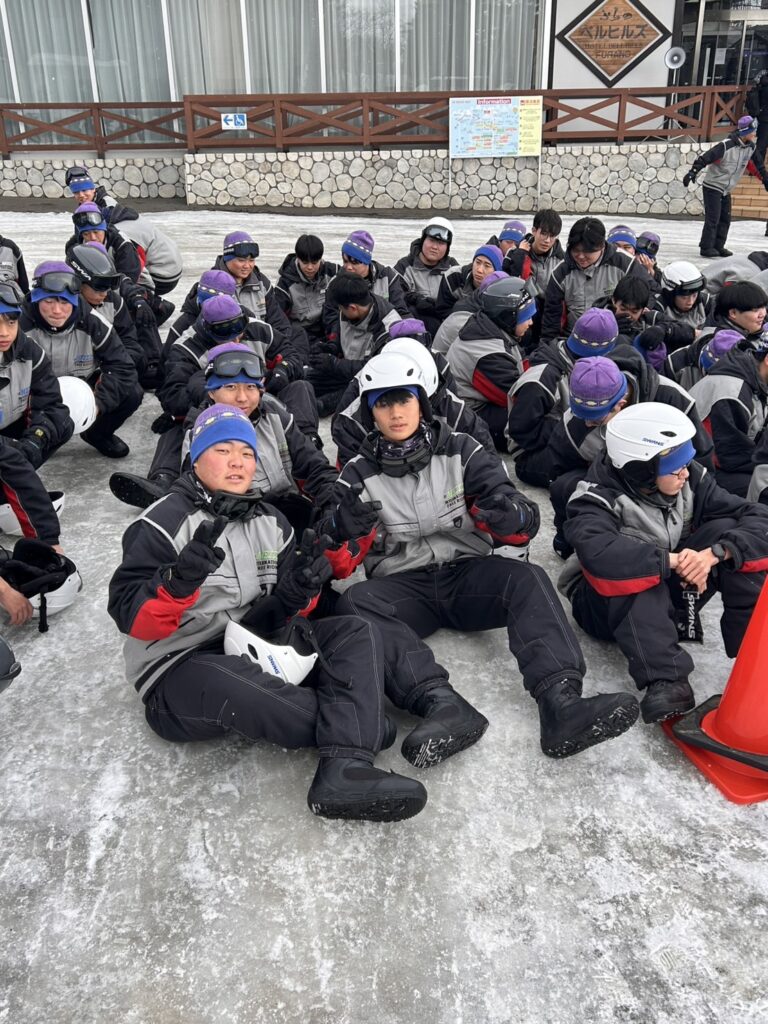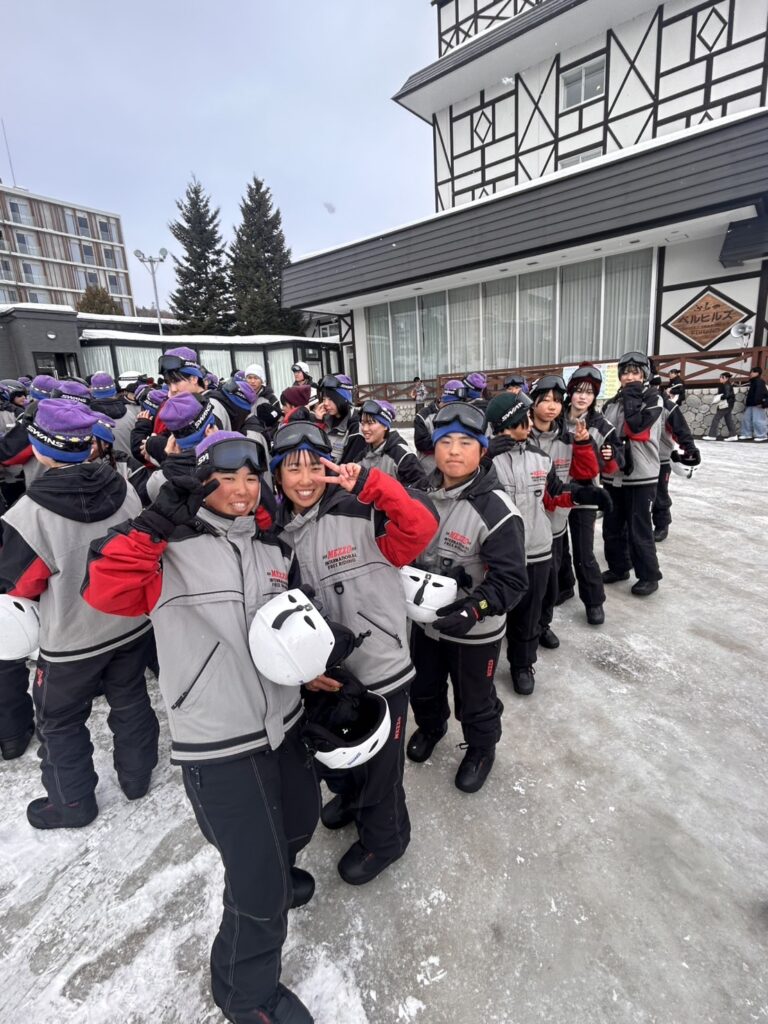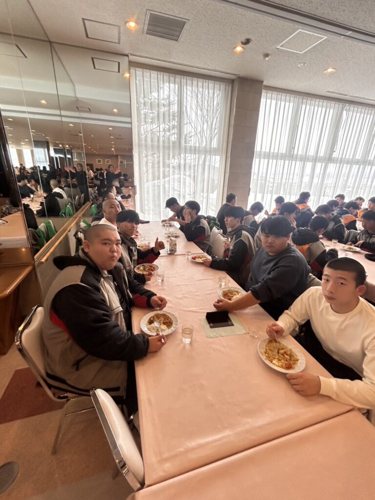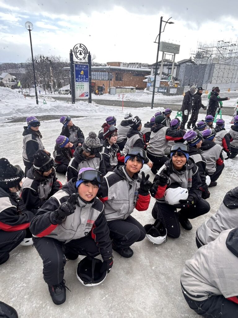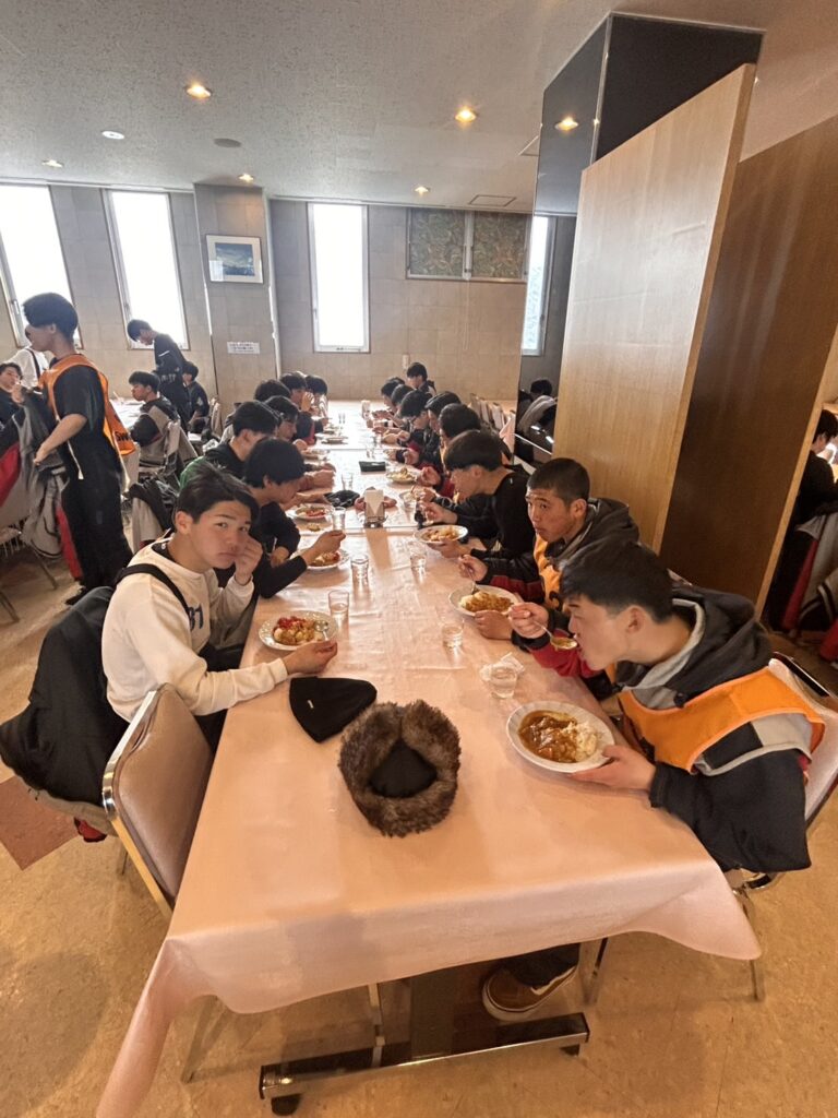 2月18日(水)修学旅行2日目。アスリートの朝は早い。走り込みや必勝祈願をして、朝ご飯。腹ごしらえをしたら、研修組は早速ゲレンデへ。スノーボードとスキーに分かれて特訓です。コツを掴むのが早いようで、ほとんどの生徒が初心者でしたが、とても楽しそうに滑っています。お昼ご飯はカレーでした。
