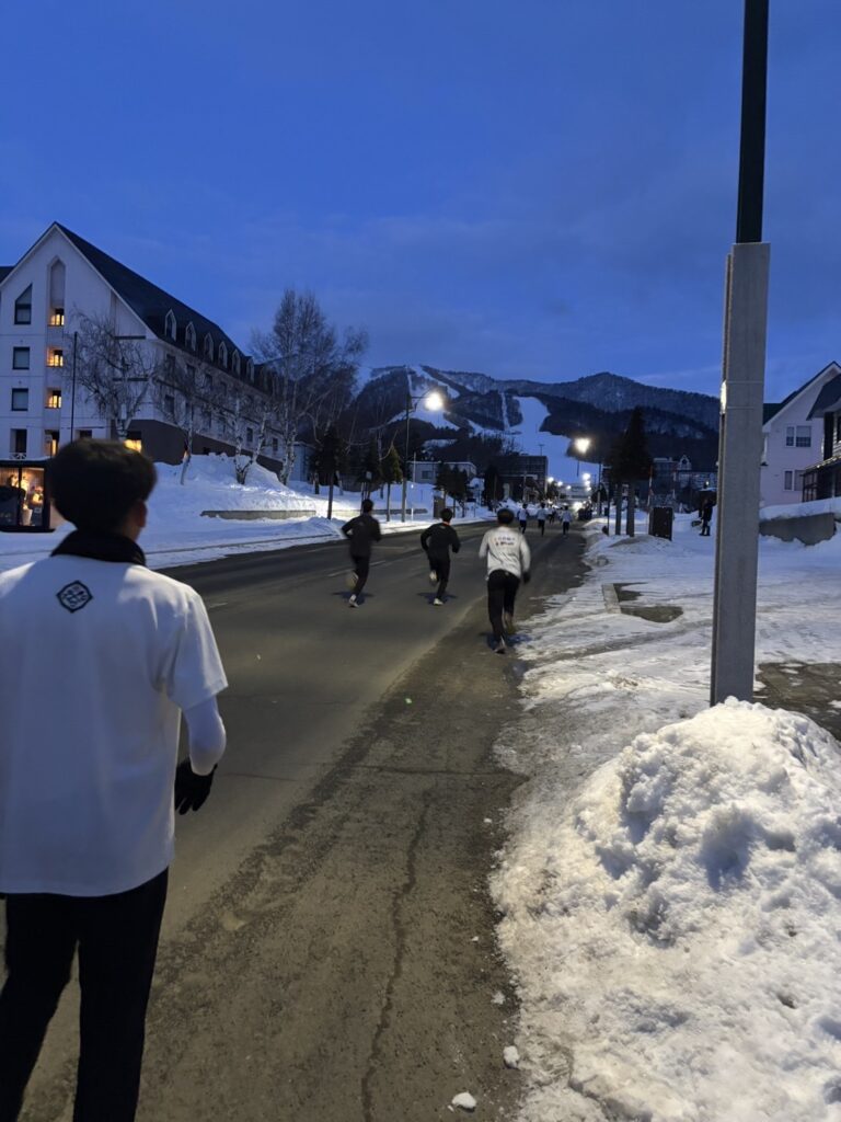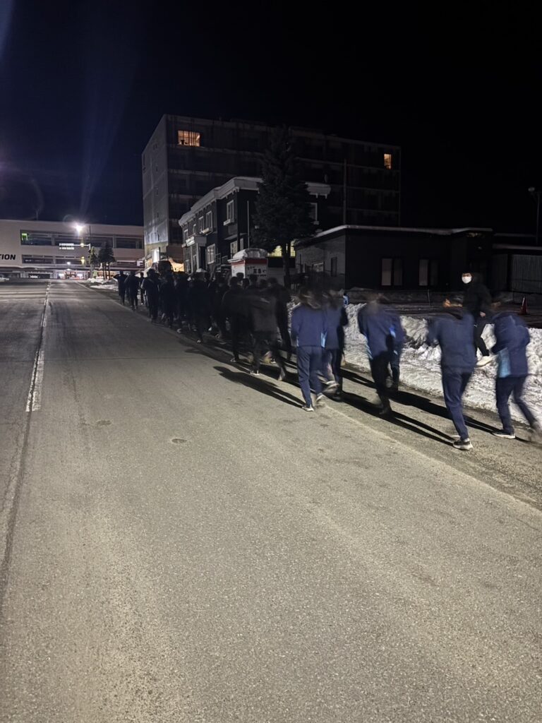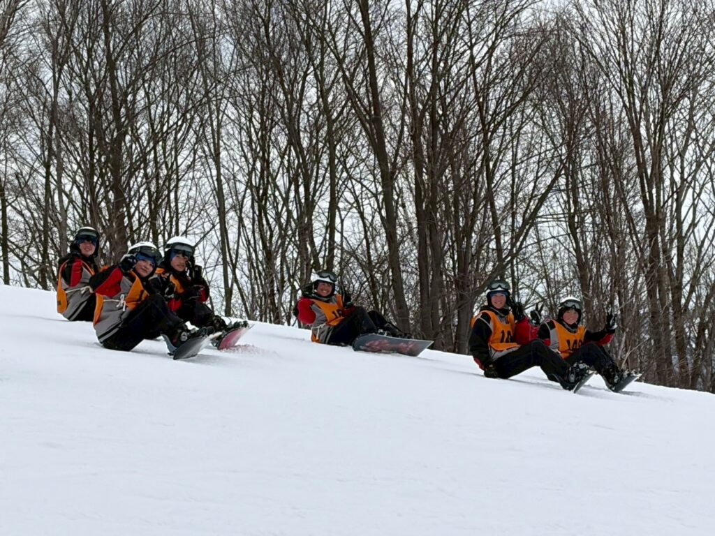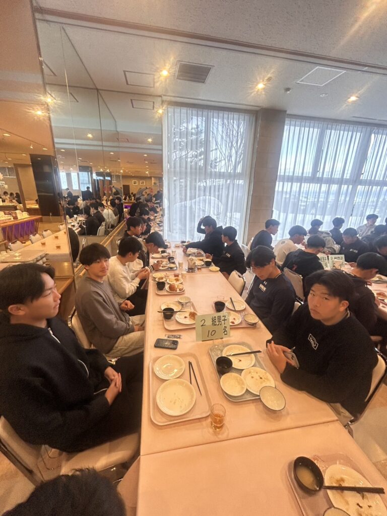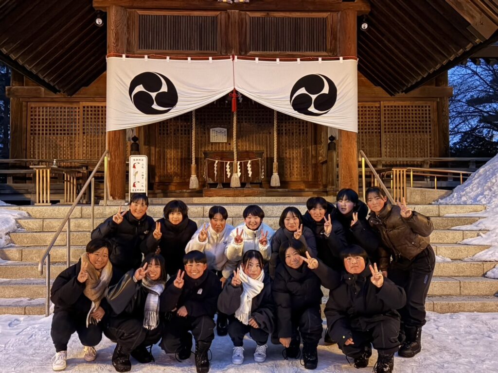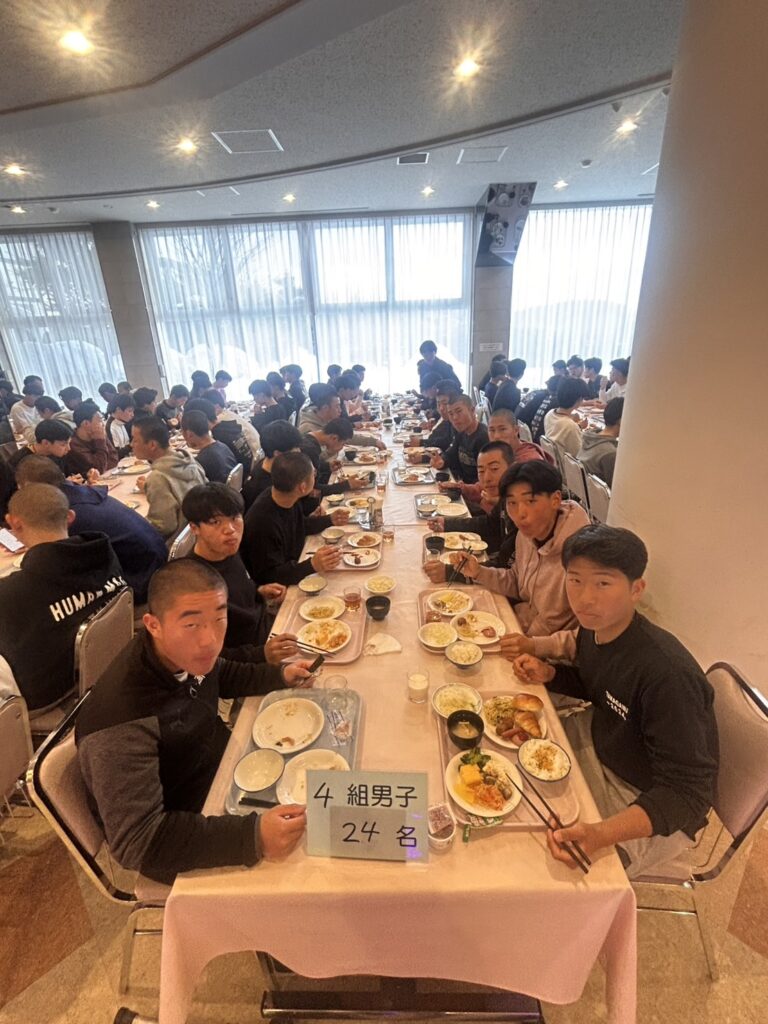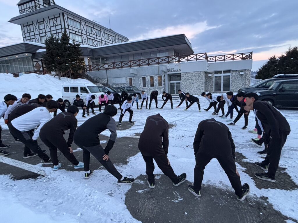 2月18日(水)修学旅行2日目。アスリートの朝は早い。走り込みや必勝祈願をして、朝ご飯。腹ごしらえをしたら、研修組は早速ゲレンデへ。スノーボードとスキーに分かれて特訓です。コツを掴むのが早いようで、ほとんどの生徒が初心者でしたが、とても楽しそうに滑っています。お昼ご飯はカレーでした。
