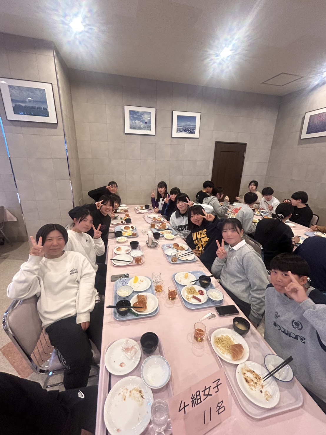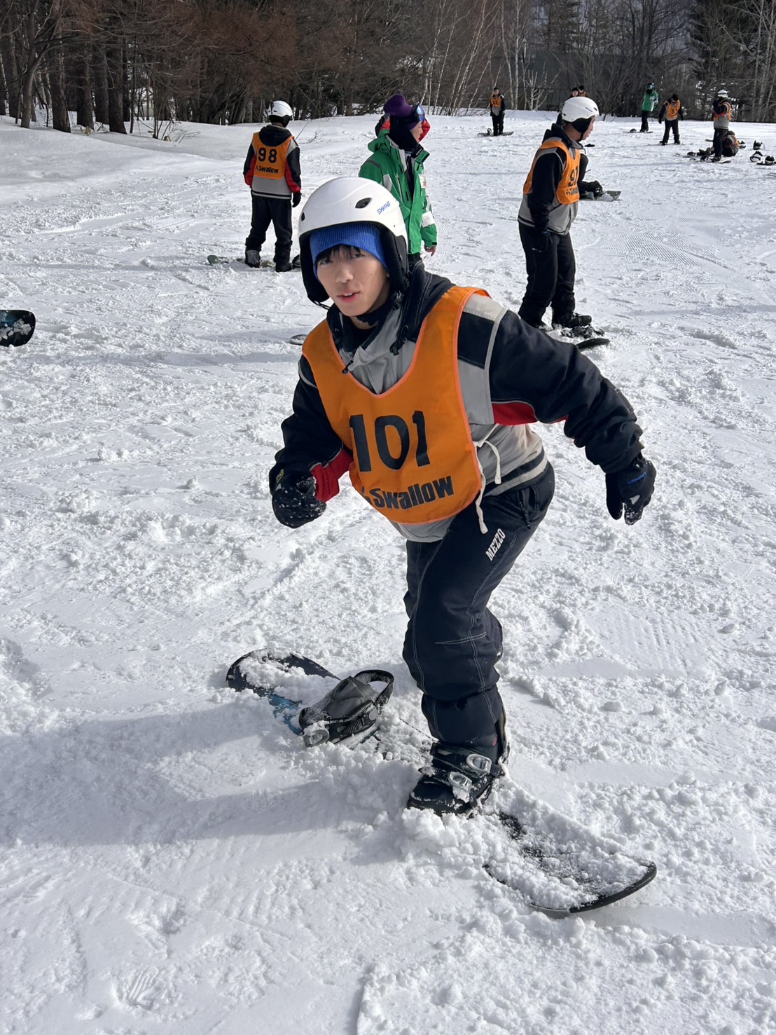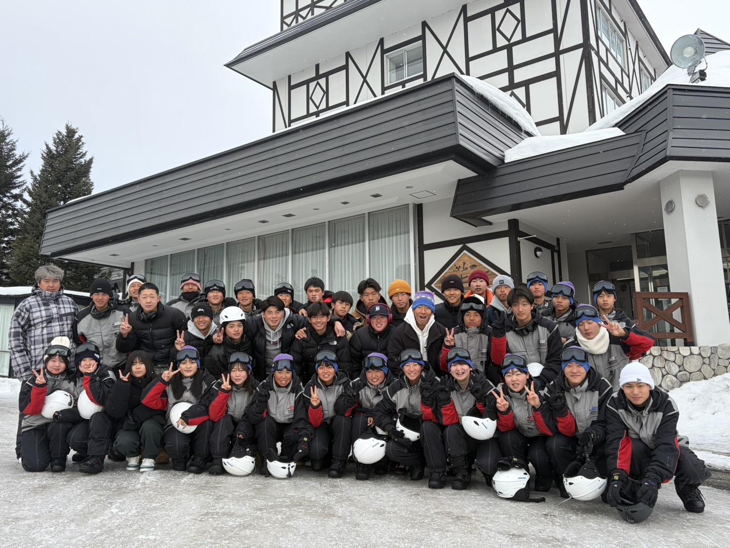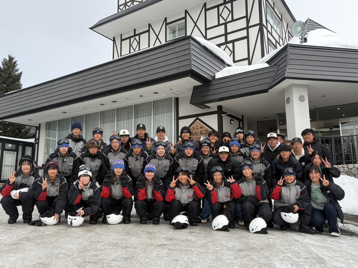 2月18日(水)修学旅行2日目。アスリートの朝は早い。走り込みや必勝祈願をして、朝ご飯。腹ごしらえをしたら、研修組は早速ゲレンデへ。スノーボードとスキーに分かれて特訓です。コツを掴むのが早いようで、ほとんどの生徒が初心者でしたが、とても楽しそうに滑っています。お昼ご飯はカレーでした。