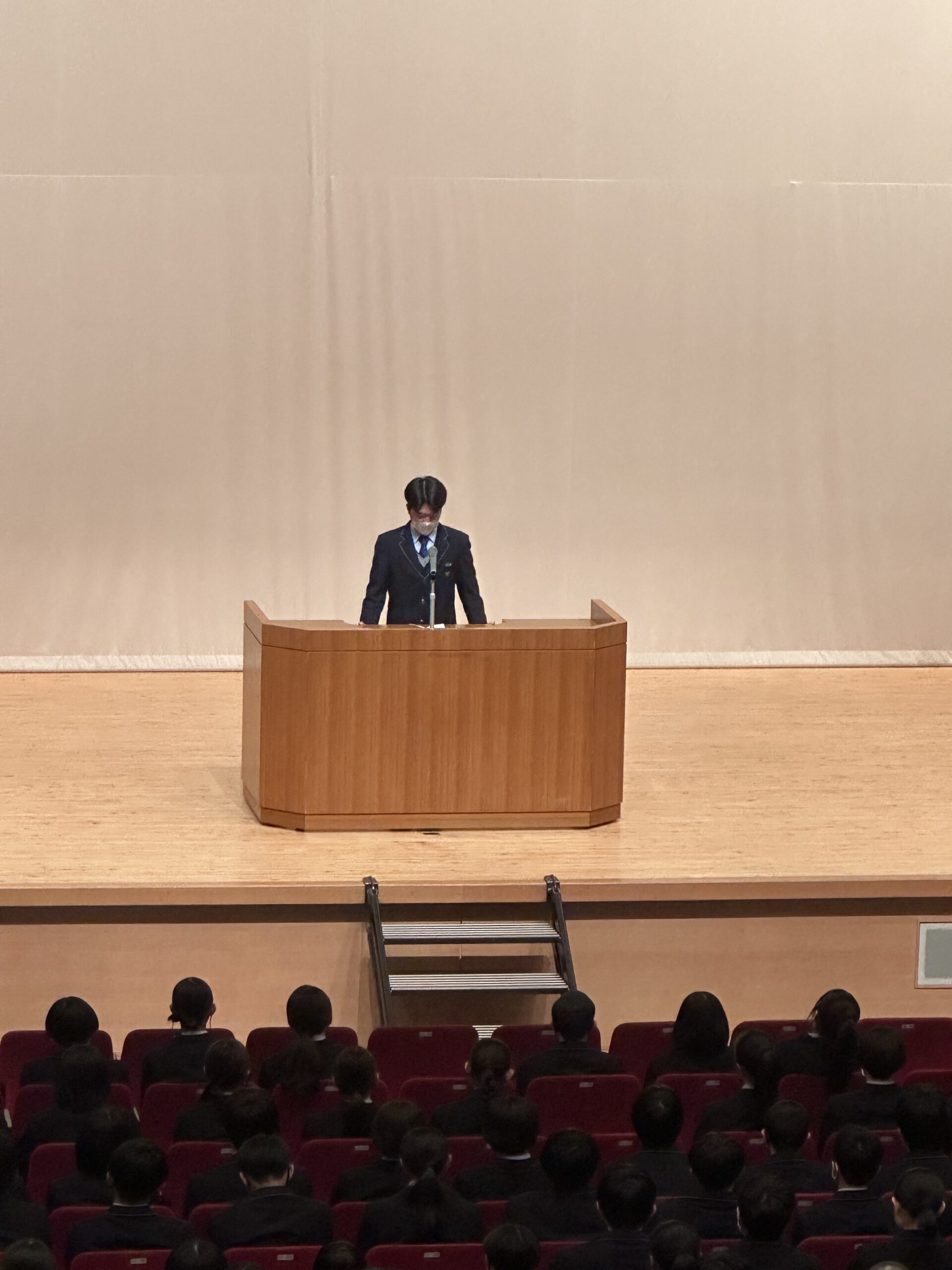 2月25日(水)の6時間目、全校生徒が講堂に集まり、新生徒会役員の決意表明が行われました。