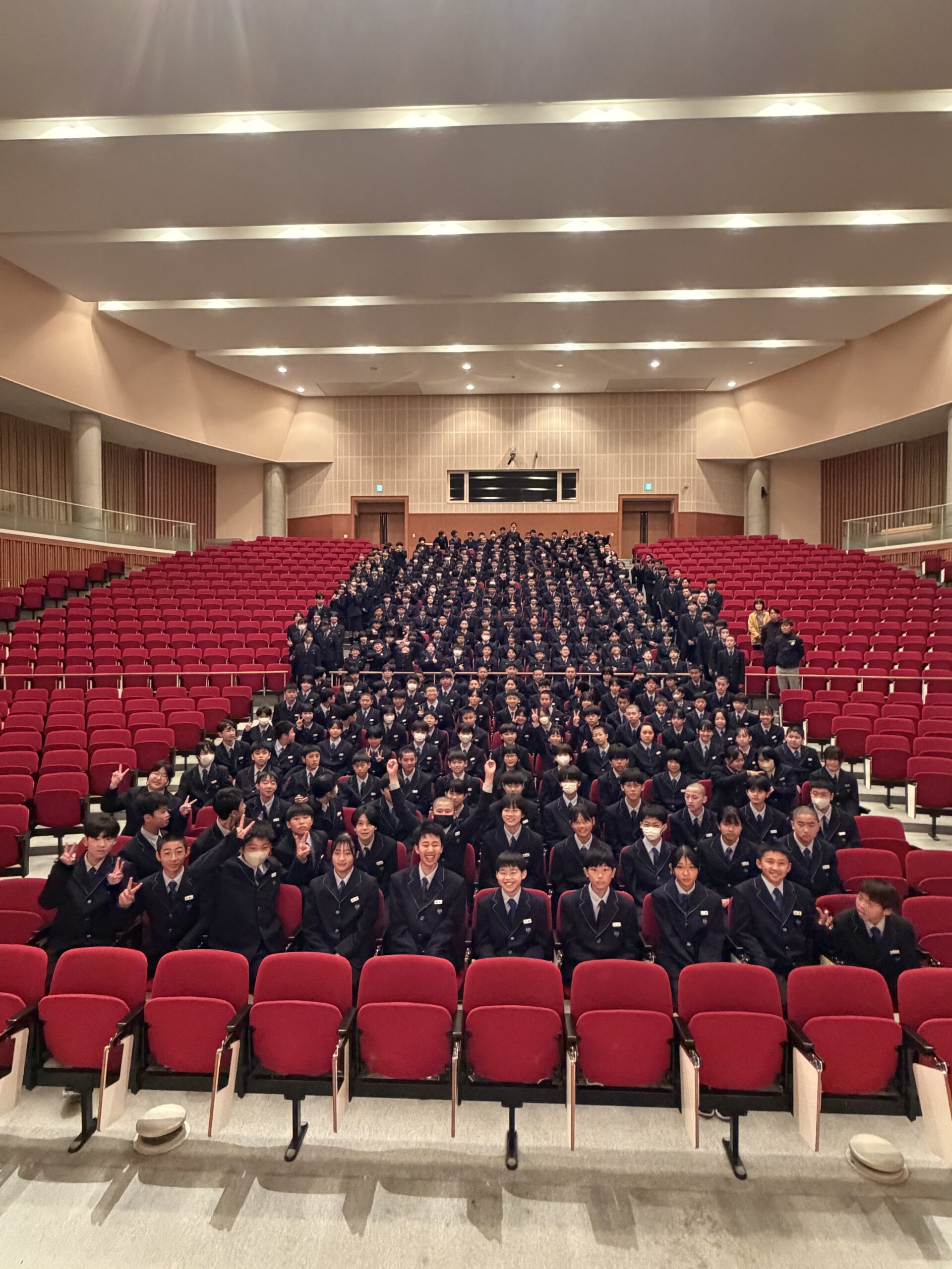 <校長講話><副校長講話><校歌斉唱>新年度に相応しい態度でした。1年間、今回のように素晴らしい態度で話を聴くことができるといいですね。1年生を前にして、記念写真も撮りました!始業式のあとは、武道場に移動して中学集会を行いました。各クラス担任の先生や、副担任の先生に自己紹介をしてもらいました。1年生は早く先生の名前を覚えよう!