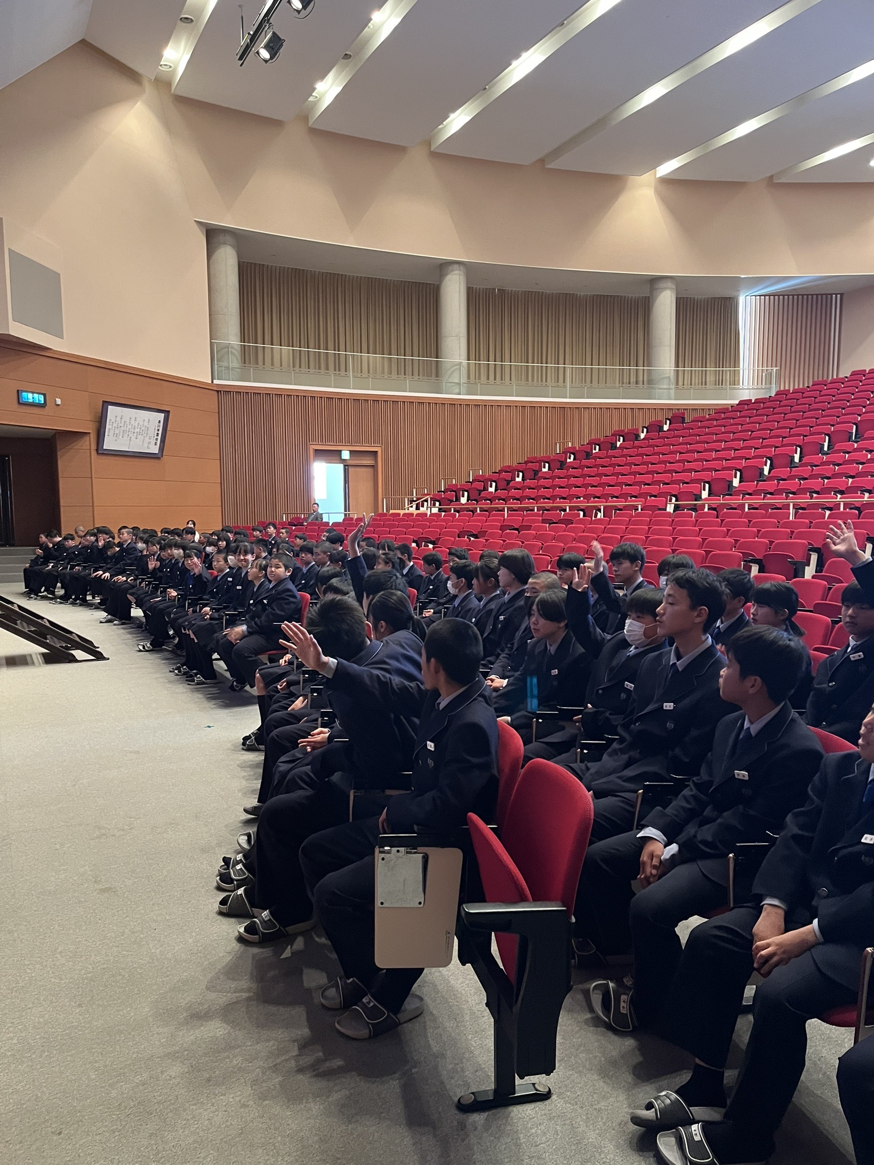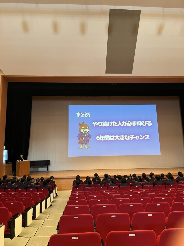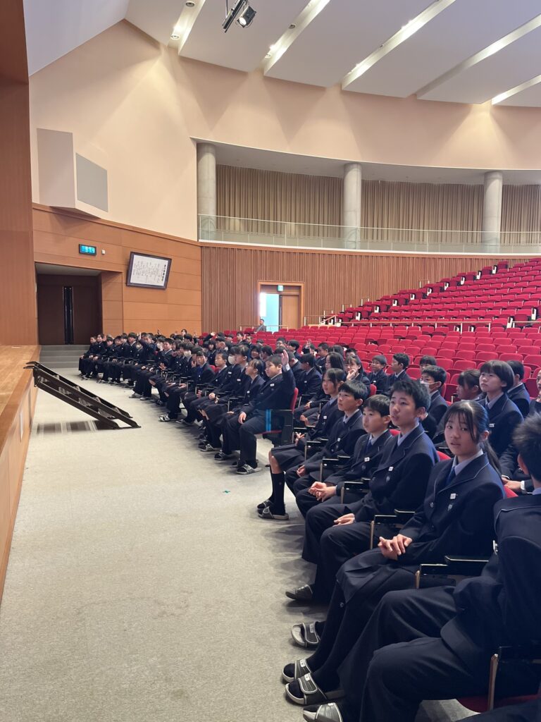 小学生と中学生は何が違うのか、どのように勉強すればいいのか、成績はどのようにつくのか、など、主に勉強に関する説明を聴きました。中高一貫校は、大きな夢を叶える為に大きく成長していける場ですね。最後に、黙想の練習もしました。